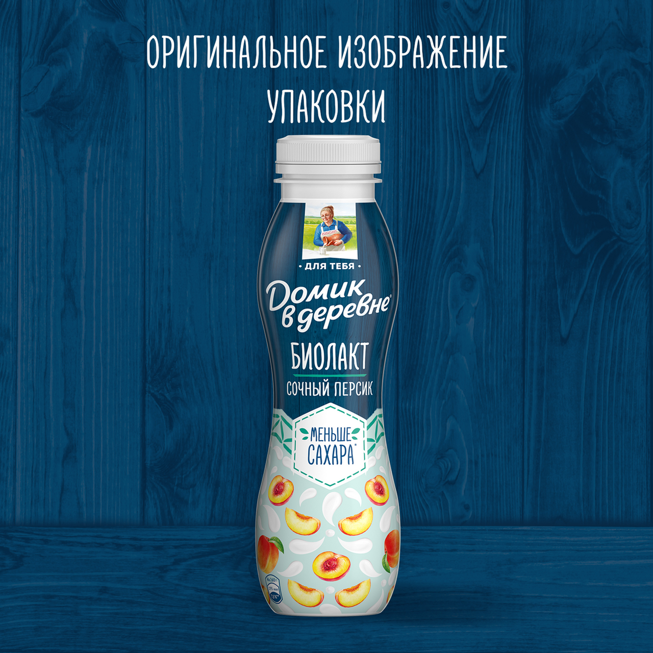 Биолакт персик Домик в Деревне с меньшим содержанием сахара - новый кисломолочный продукт из натурального, топленого молока и закваски, имеет приятный вкус и нежную консистенцию. Благодаря удобному формату бутылочки ее легко взять его с собой в дорогу и на работу. Попробуйте новинки Домик в деревне- ряженка со спелой грушей и ряженка с клубникой, которые прекрасно подойдут для вкусного перекуса в течение дня.
