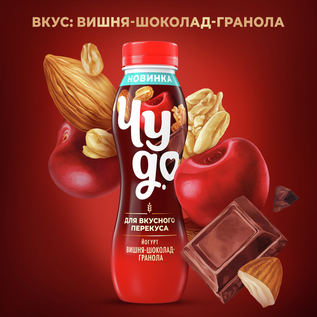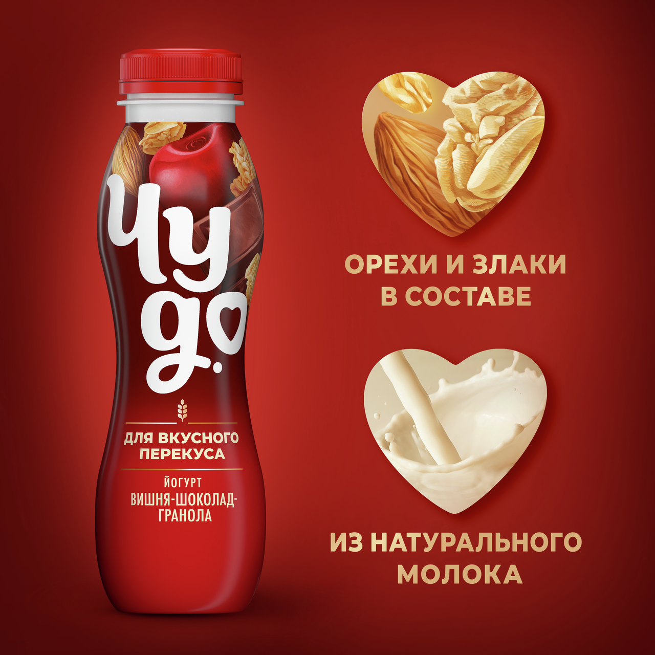 Йогурт Чудо Вишня-шоколад-гранола – питьевой йогурт на основе натурального молока с добавлением злаков. В состав напитка входят зерновые, пшеничные, ячменные и овсяные хлопья, семена чиа, семена льна и миндаль. Йогурт со злаками в небольшой бутылочке удобно взять с собой на вкусный перекус в течение дня; перед употреблением следует встряхнуть. Обновленное Чудо прямо в сердечко!