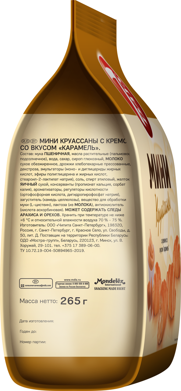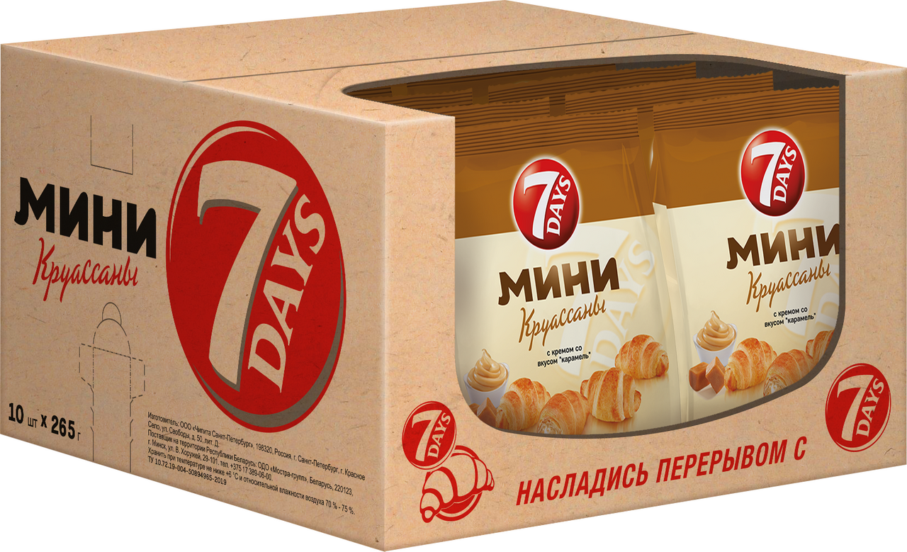 Участвует в конкурсе: Выиграйте кофемашину на сладкое! Совершите покупку товаров-участников на сумму от 1500₽ с 23 октября 2025г. по 14 января 2026г. и получите шанс выиграть кофемашину или другие сладкие призы! Чем больше покупок - тем больше шансов на победу! Подробнее об акции - https://cdn.metro-cc.ru/ru/mndlz_2025.pdf. Мини круассаны 7Days с кремом какао - воздушные круассаны из мягкого слоеного теста с нежной кремовой начинкой карамель. Идеальное сочетание оригинального насыщенного вкуса, нежной текстуры и высокого качества для настоящих ценителей сладостей. Мини круассаны прекрасно сочетаются с чаем и кофе. Найдите свой идеальный дуэт! Выпечка в упаковке 265г подойдет для семьи или компании. Также круассаны в большой упаковке можно взять с собой для пикника и для поездки в поезде.