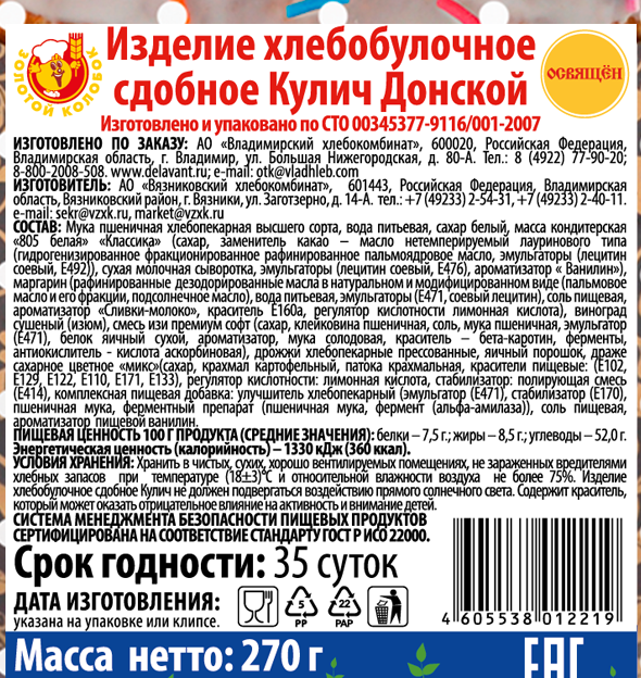 Кекс Донской от бренда Золотой колобок – вкусное тающее угощение, которое никого не оставит равнодушным. Оно готовится из ароматного теста с добавлением помадки и отборного изюма. Десерт буквально тает во рту. Нежнейший кекс Донской с оригинальным ароматом подарит настоящее гастрономическое удовольствие самому взыскательному гурману.