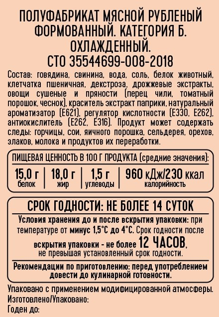 Говядина, свинина, вода, белок животный, клетчатка пшеничная, декстроза, овощи сушёные и пряности перец чили, томатный порошок, чеснок, антиокислители Е223, Е316, регулятор кислотности Е330.