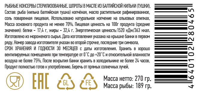 Шпроты в масле Золотистая рыбка ГОСТ, 270г - это натуральный продукт премиального качества. Консервы изготавливаются только из натуральных продуктов, без использования консервантов, красителей, искусственных добавок и ГМО. Шпроты в масле из балтийской кильки с ярким и насыщенным вкусом станут прекрасным дополнением к столу в любое время дня на обед и ужин. Шпроты идеально подойдут как для любителей активных видов отдыха: рыболовов, охотников, путешественников, туристов, так и дачников и домохозяек.