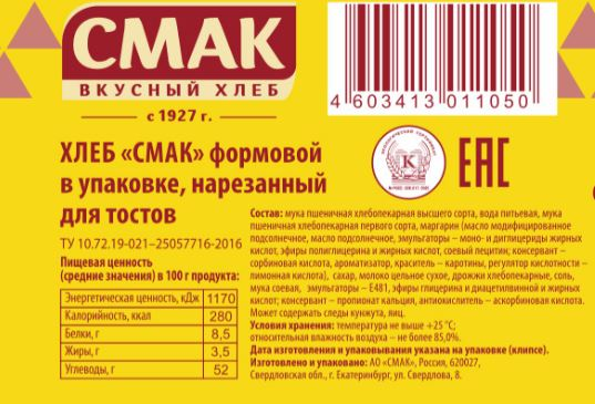 Хлеб Смак для сэндвичей и тостов нарезка, 275г