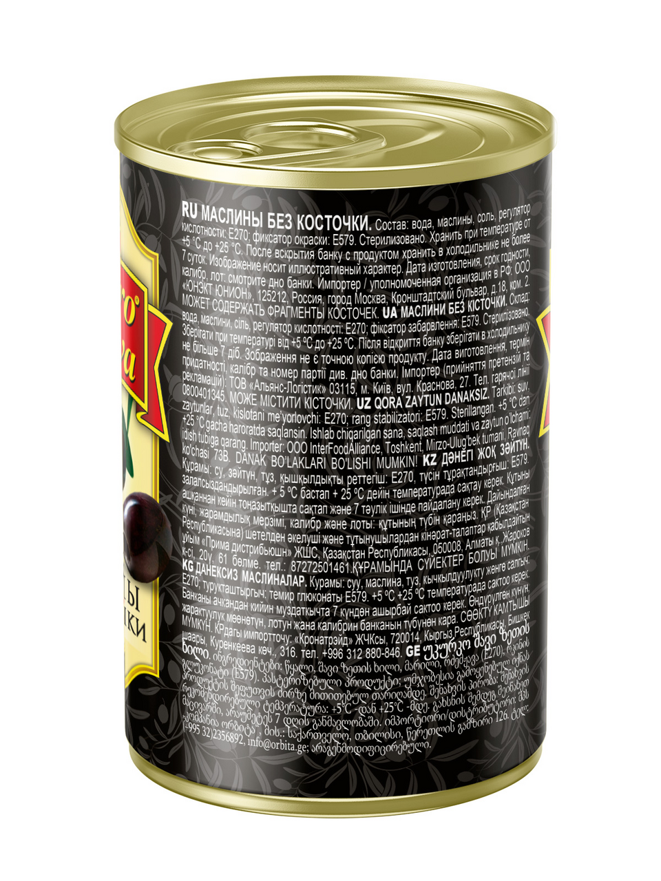 Маслины, вода, соль, регулятор кислотности Е270, фиксатор окраски Е579.
