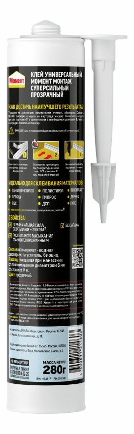 Обладает высокой начальной силой склеивания (70 кг/м2) и отлично подходит для различных ремонтных работ. Области применения: стиропор, пенопласт, полистирол, дерево, металл, ПВХ, керамика, ДСП, гипсокартон, пробка, гипс и другие подобные материалы. Не подходит для полиэтилена, полипропилена, тефлона. Внешний вид и/или характеристики товара могут быть изменены производителем в соответствии с производственным процессом.