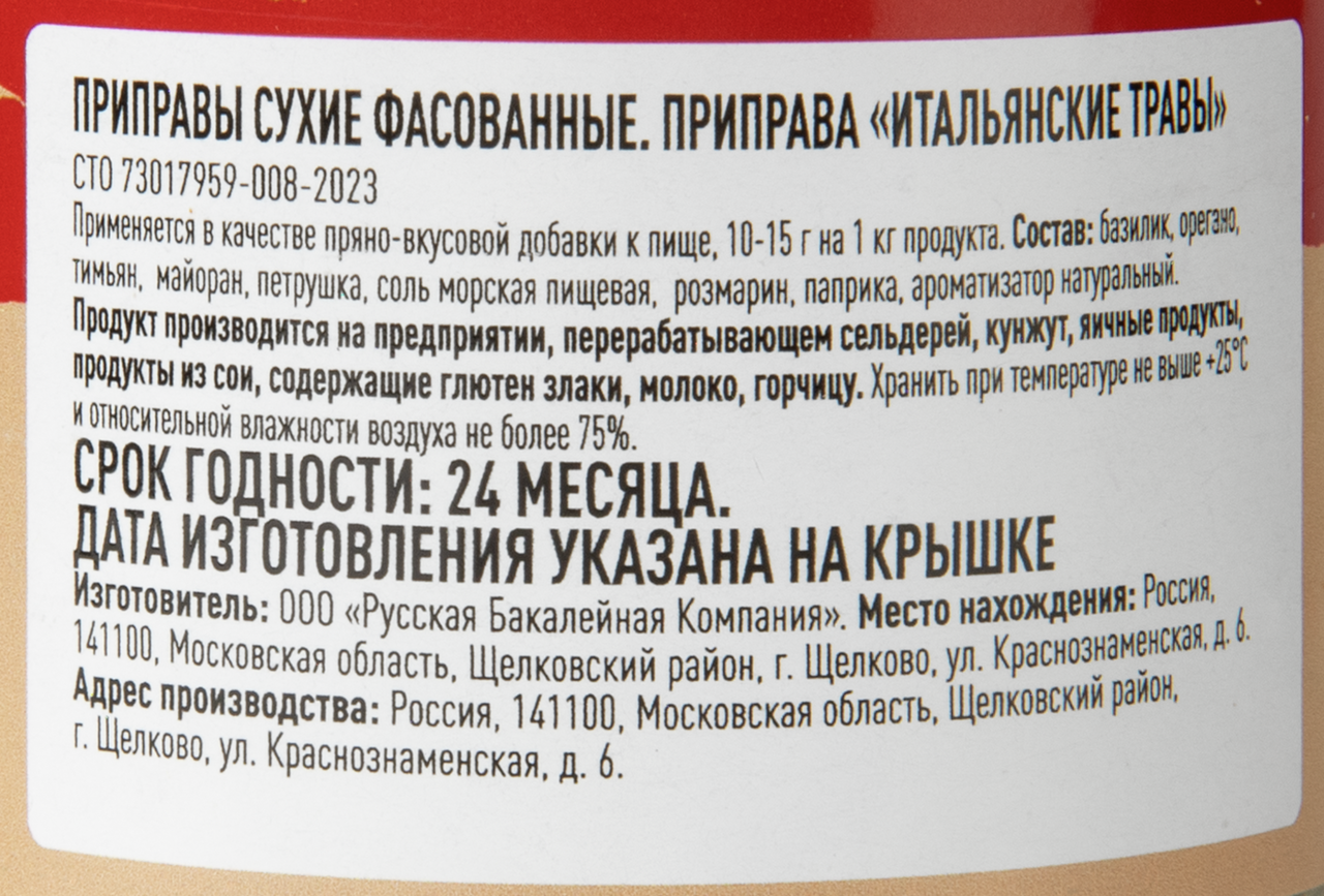 Применяют в качестве пряно-вкусовой добавки к пище. Включает только отборные и качественные ингредиенты: душистый базилик, пряный тимьян, чабер и розмарин. Они были бережно высушены с контролем качества на каждом этапе и собраны в особую композицию, которая ваши блюда необыкновенным ароматом и придаст им вкус итальянской кухни.