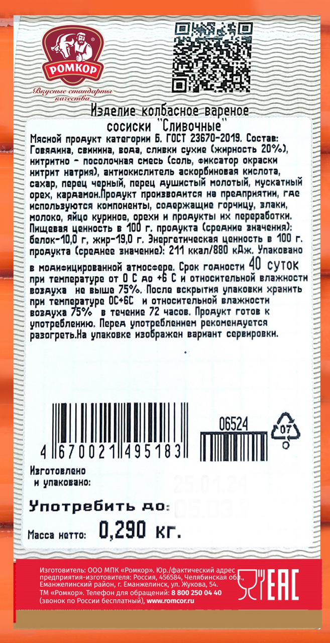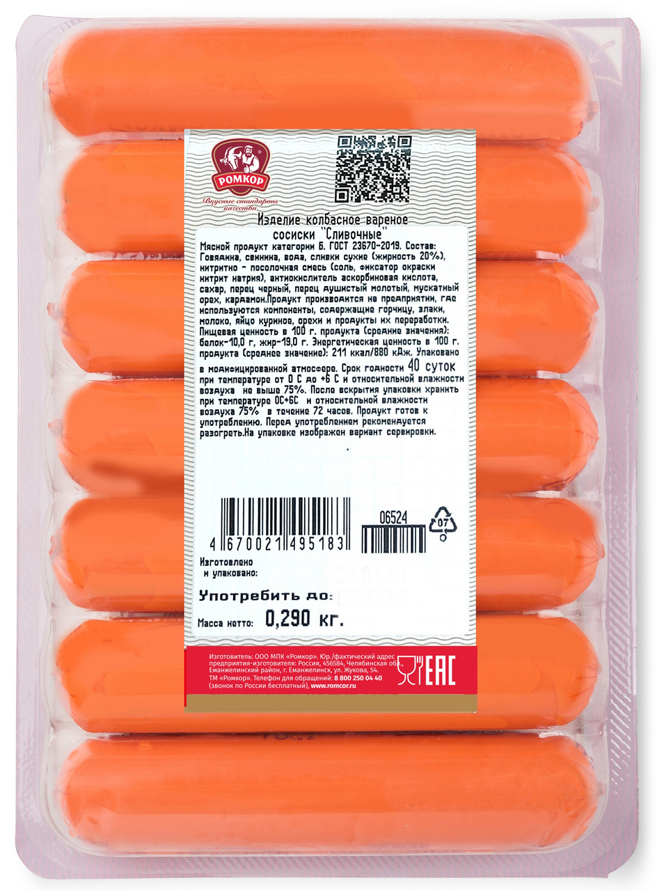 Сосиски Ромкор Сливочные вареные ГОСТ, 290г
