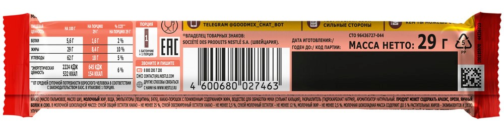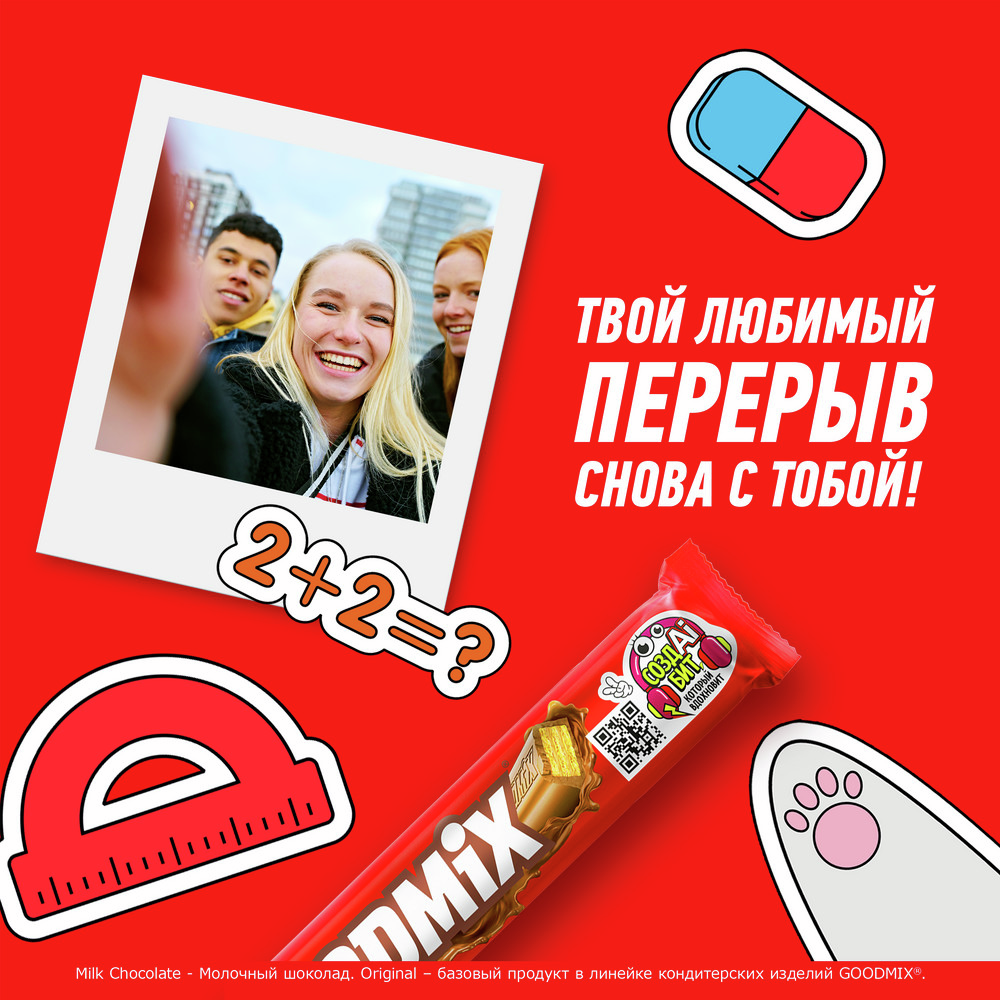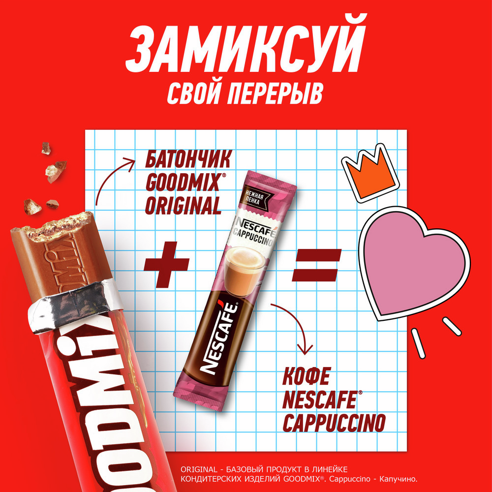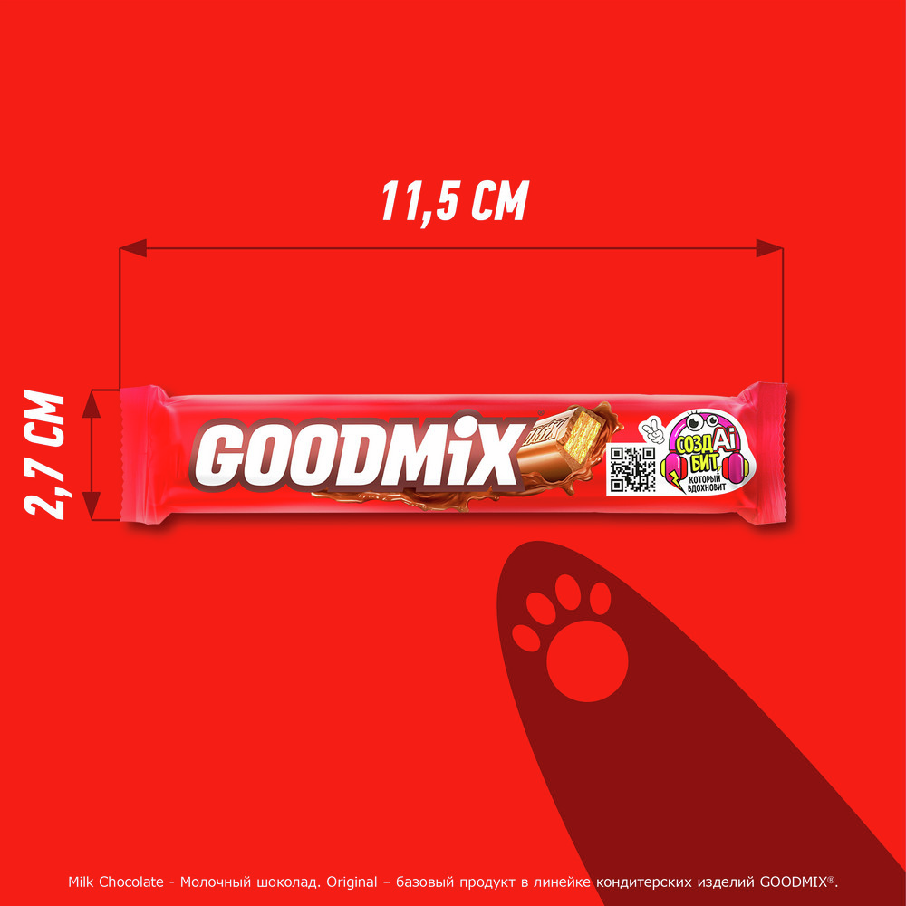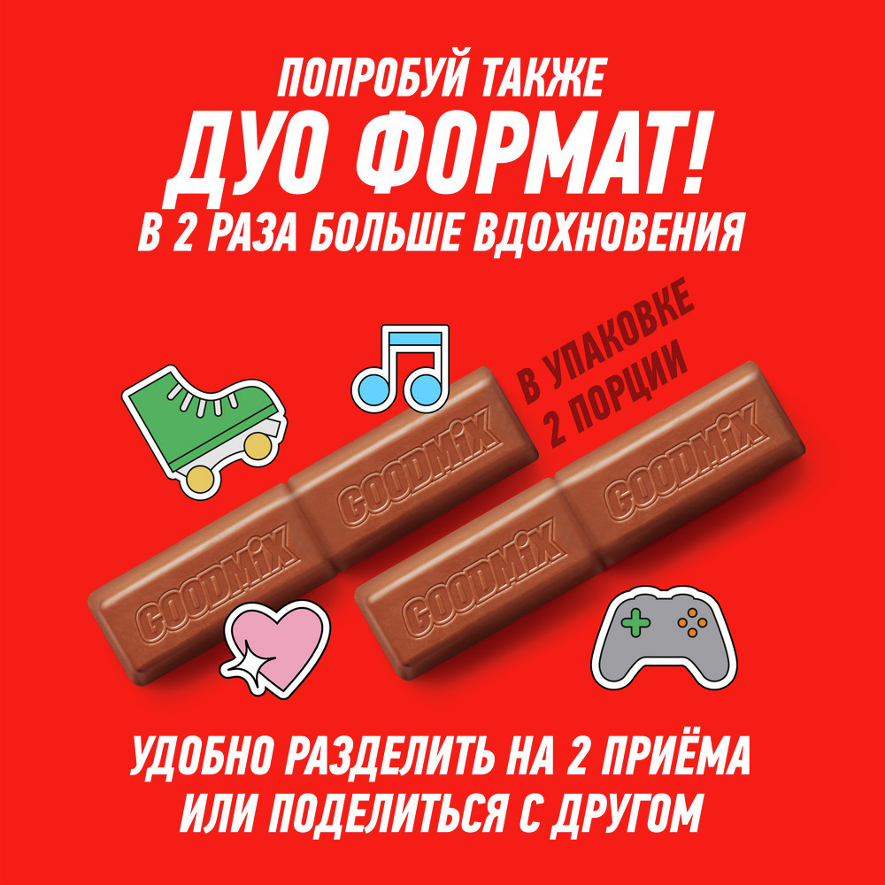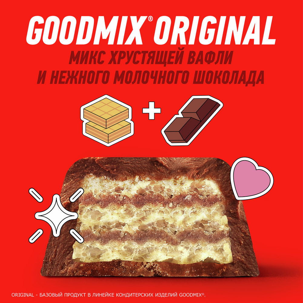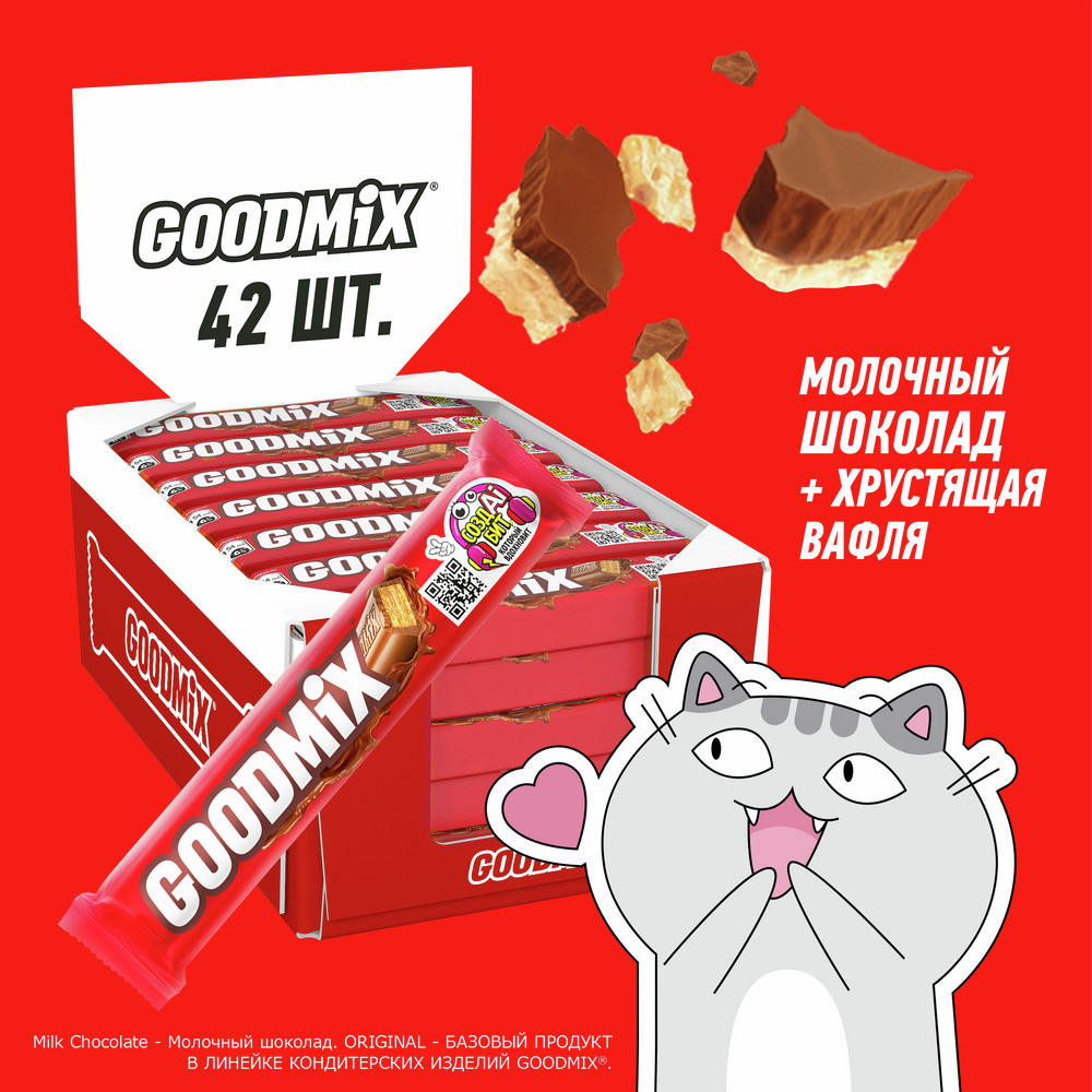 Шоколадный батончик Goodmix Original с молочным шоколадом и с хрустящей вафлей от компании Nestle. Батончик Goodmix Original - это идеальный микс хрустящей вафли и нежного молочного шоколада, дарящий вдохновение и хорошее настроение. Невероятное сочетание молочного шоколада и хрустящей вафли одинаково по душе и взрослым, и маленьким любителям сладостей. Батончик Goodmix - отличный вариант для быстрого утоления голода. Насладитесь вкусным батончиком Goodmix от известного производителя кондитерских изделий. Шоколад от компании Nestle производится без искусственных красителей, ароматизаторов и консервантов. Качество всех исходных ингредиентов тщательно проверяется на соответствие высоким стандартам качества компании.