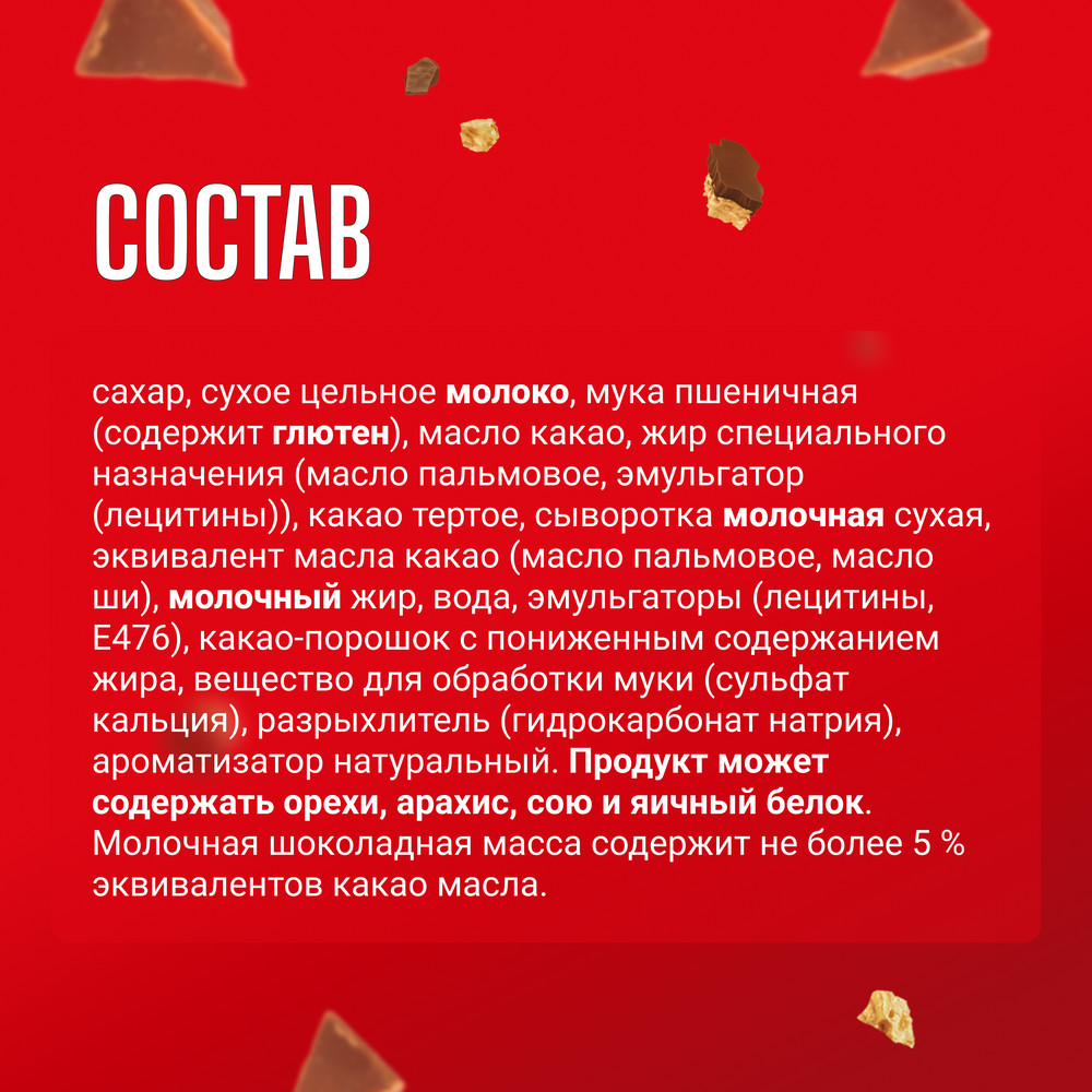 Сахар, сухое цельное молоко, мука пшеничная содержит глютен, масло какао, какао тёртое, жир специального назначения масло пальмовое, эмульгатор лецитины, сыворотка молочная сухая, эквивалент масла какао масло пальмовое, масло ши, молочный жир, эмульгаторы лецитины, Е476, какао порошок, вещество для обработки муки сульфат кальция, разрыхлитель гидрокарбонат натрия, ароматизатор натуральный.