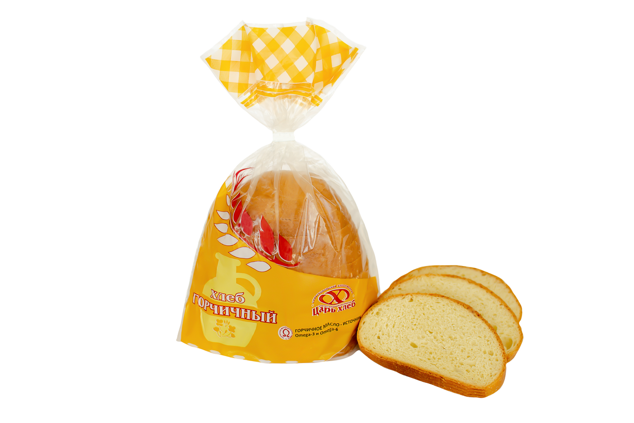 Содержит в составе горчичное масло - природный источник ненасыщенных жирных кислот Omega-3 и Omega-6. Имеет тонкую золотистую корочку, сладковатый вкус и воздушный ароматный мякиш. Изготовлен из пшеничной муки высшего сорта.