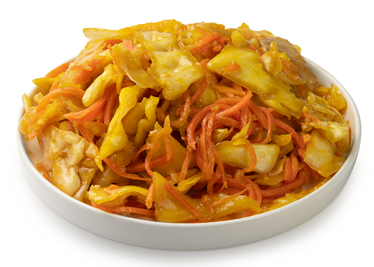 Капуста белокочанная, морковь, масло растительное подсолнечное, соль, чеснок, усилитель вкуса и аромата Е621, уксус, кунжут, кинза, перец паприка, перец красный молотый, консерванты: Е202 и Е211, подсластители: Е952, Е954.