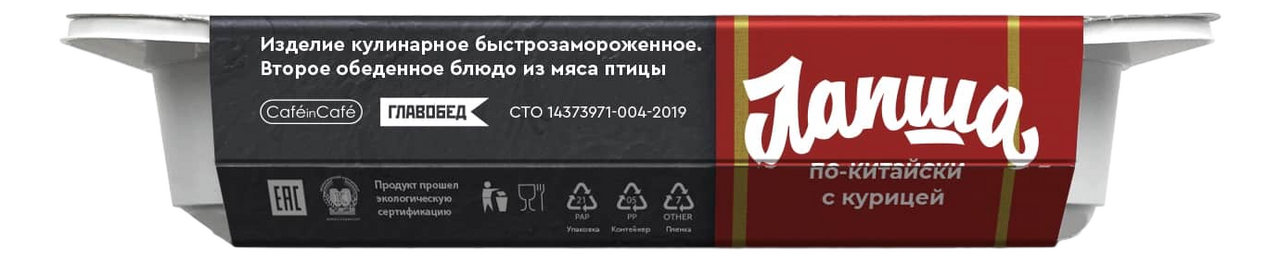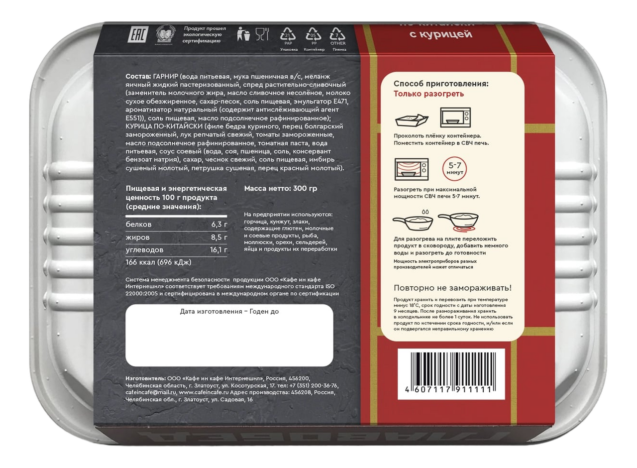 Гарнир: вода питьевая, мука пшеничная в/с, меланж яичный жидкий пастеризованный, спред растительно-сливочный (заменитель молочного жира, масло сливочное несоленое, молоко сухое обезжиренное, сахар-песок, соль пищевая, эмульгатор Е471, ароматизатор натуральный (содержит антислеживающий агент Е551)), соль пищевая, масло подсолнечное рафинированное; курица по-китайски: филе бедра куриного, перец болгарский замороженный, лук репчатый свежий, томаты замороженные, масло подсолнечное рафинированное, томатная паста, вода питьевая, соус соевый (вода, соя, пшеница, соль, консервант Е211), сахар, чеснок свежий, соль пищевая, имбирь сушеный молотый, петрушка сушеная, перец красный молотый.
