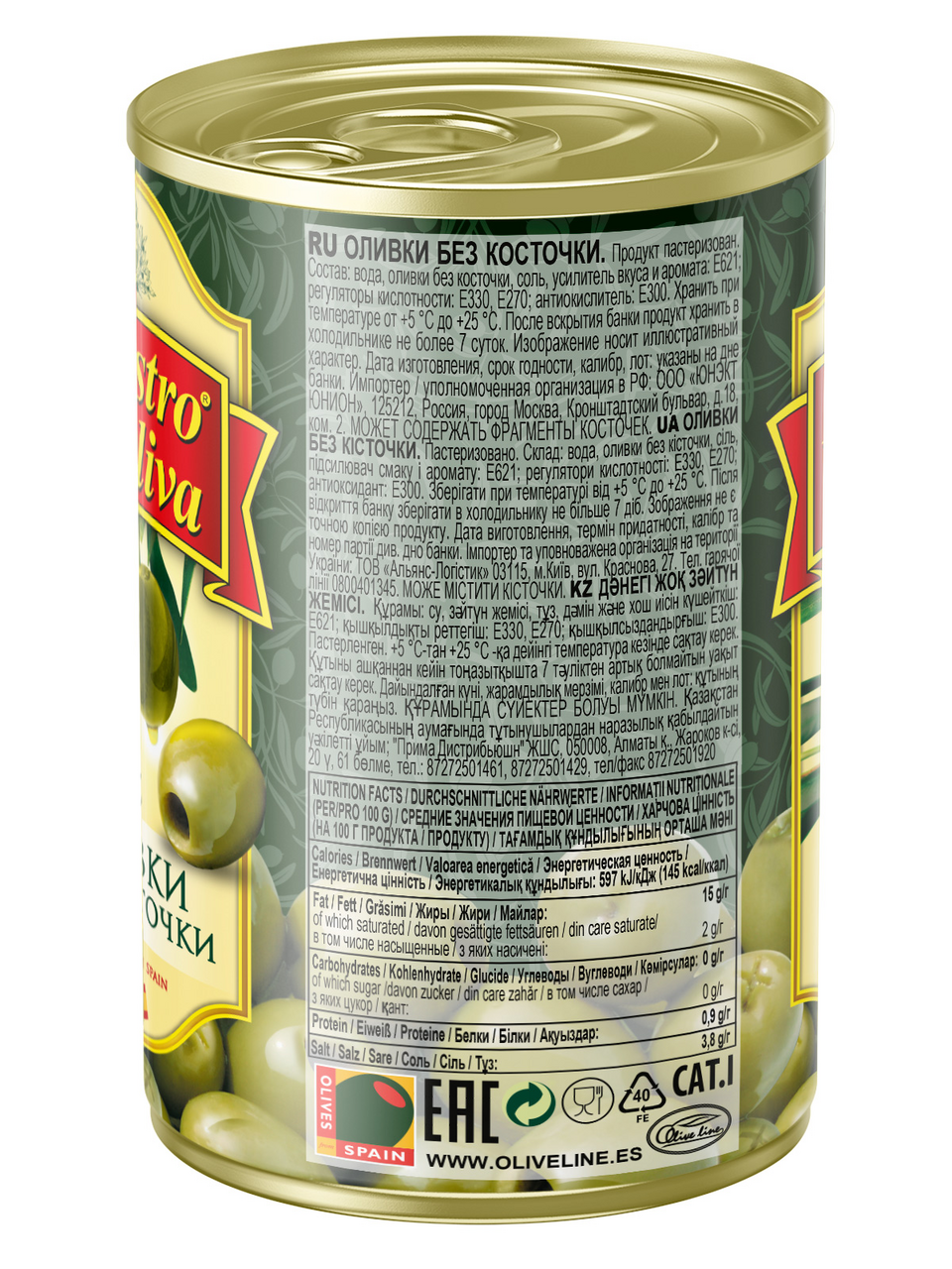 Оливки без косточки, вода, соль, усилитель вкуса и аромата Е621, регулятор кислотности Е330, Е270, антиокислитель Е300.