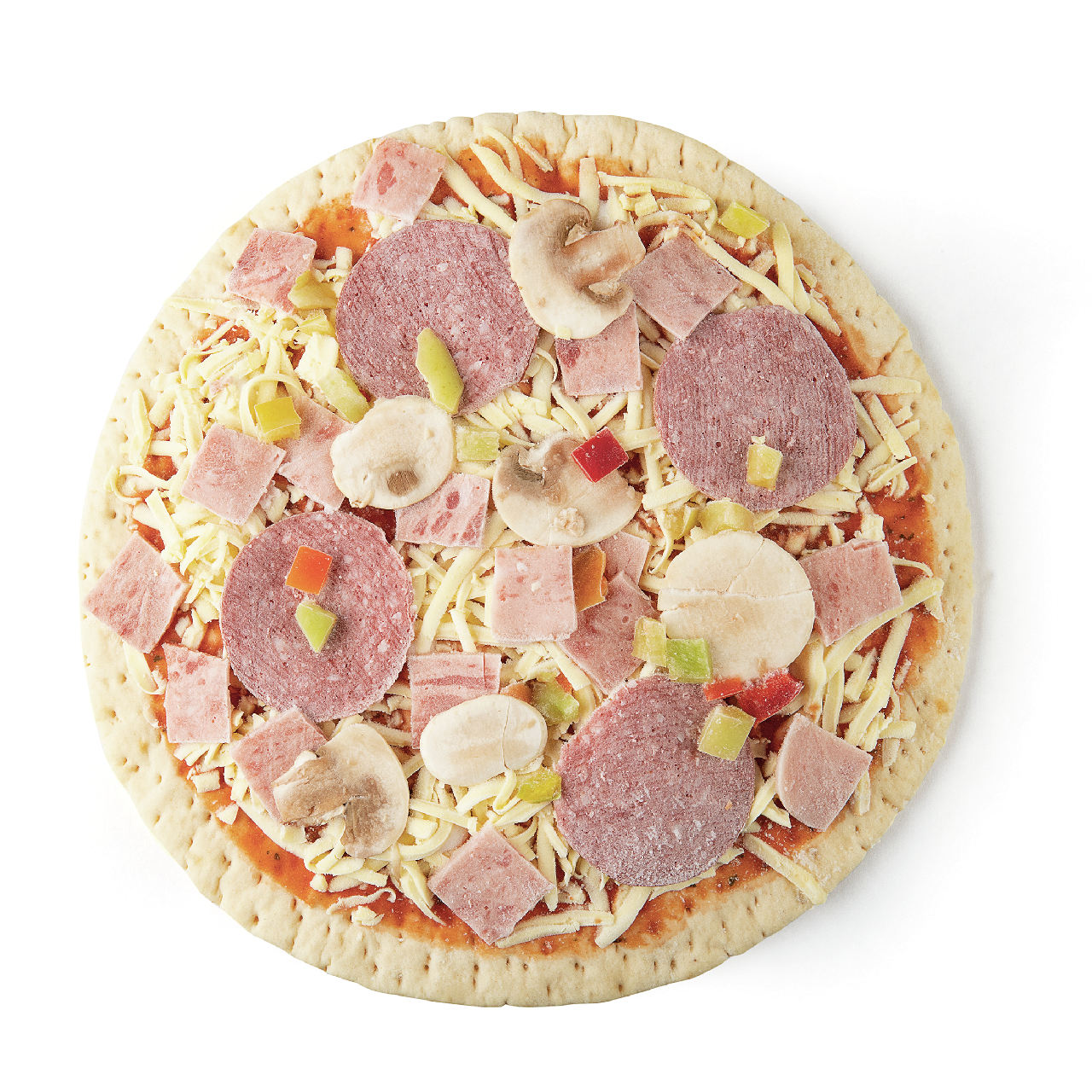 Тестовая основа мука пшеничная хлебопекарная высшего сорта, вода питьевая, масло подсолнечное рафинированное дезодорированное, дрожжи прессованные хлебопекарные, соль поваренная пищевая содержит агент антислеживающий Е536, комплексная пищевая добавка паста для сбивания вода питьевая, сахар, эмульгаторы Е470, Е471, Е475, влагоудерживающие агенты Е422, Е1520, консервант сорбат калия, сахар, разрыхлитель гидрокарбонат натрия, томатный соус вода питьевая, томатная паста, сахар, крахмал картофельный, соль содержит агент антислеживающий Е536, базилик молотый, перец чёрный молотый, перец красный Чили молотый, кориандр молотый, орегано молотый, краситель Е124, комплексная пищевая добавка регуляторы кислотности Е262i, Е262ii, Е331iii, антиокислитель Е300, соль, сыр пастеризованное молоко, закваска термофильных молочнокислых микроорганизмов, молокосвертывающий ферментный препарат микробного происхождения, соль поваренная пищевая, регулятор кислотности – лимонная кислота, уплотнитель - хлорид кальция, ветчина свинина, вода питьевая, филе грудок куриных, мясо птицы механической обвалки, загуститель крахмал картофельный, животный белок, стабилизатор пирофосфаты, регуляторы кислотности трифосфаты, ацетат натрия, диацетат натрия, Е331iii, желирующий агент Е407, сахар, усилители вкуса и аромата Е621, антиокислители: изоаскорбат натрия, аскорбиновая кислота; экстракты пряностей, смесь посолочно-нитритная соль, фиксатор окраски нитрит натрия, декстроза, мальтодекстрин, соль, ароматизатор пищевой ветчины, краситель кармины, колбаса варено-копченая филе куриное, свинина, белковый стабилизатор, вода питьевая, крахмал картофельный, соль, соевый белок, загуститель - каррагинан, регуляторы кислотности: пирофосфат натрия, цитрат натрия; антиокислители: изоаскорбат натрия, лимонная кислота; ароматизатор, декстроза, усилитель вкуса и аромата - глутамат натрия, краситель - кармины, фиксатор окраски - нитрит натрия, соус майонез масло подсолнечное рафинированное и дезодорированное, вода питьевая, загуститель-крахмал картофельный модифицированный, яичный желток, соль поваренная пищевая, сахар-песок, стабилизатор - ксантановая и гуаровая камеди, регулятор кислотности - уксусная кислота, ароматизатор натуральный горчица, ароматизатор пищевой Сливки, консервант - сорбат калия, вода питьевая, сахар, соль поваренная пищевая содержит агент антислеживающий Е536, шампиньоны, перец зелёный сладкий резаный, крахмал картофельный. Содержит краситель, который может оказывать отрицательное влияние на активность и внимание детей.