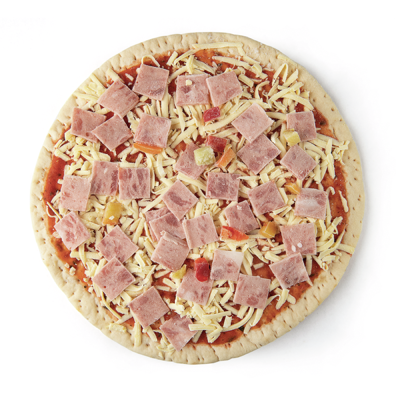 Тестовая основа мука пшеничная хлебопекарная высшего сорта, вода питьевая, масло подсолнечное рафинированное дезодорированное, дрожжи прессованные хлебопекарные, соль поваренная пищевая содержит агент антислеживающий Е536, комплексная пищевая добавка паста для сбивания вода питьевая, сахар, эмульгаторы Е470, Е471, Е475, влагоудерживающие агенты Е422, Е1520, консервант сорбат калия, сахар, разрыхлитель гидрокарбонат натрия, томатный соус вода питьевая, томатная паста, сахар, крахмал картофельный, соль содержит агент антислеживающий Е536, базилик молотый, перец чёрный молотый, перец красный Чили молотый, кориандр молотый, орегано молотый, краситель Е124, комплексная пищевая добавка регуляторы кислотности Е262i, Е262ii, Е331iii, антиокислитель Е300, соль, ветчина свинина, вода питьевая, филе грудок куриных, мясо птицы механической обвалки, загуститель крахмал картофельный, животный белок, стабилизатор пирофосфаты, регуляторы кислотности трифосфаты, ацетат натрия, диацетат натрия, Е331iii, желирующий агент Е407, сахар, усилители вкуса и аромата Е621, антиокислители: изоаскорбат натрия, аскорбиновая кислота; экстракты пряностей, смесь посолочно-нитритная соль, фиксатор окраски нитрит натрия, декстроза, мальтодекстрин, соль, ароматизатор пищевой ветчины, краситель кармины, сыр пастеризованное молоко, закваска термофильных молочнокислых микроорганизмов, молокосвертывающий ферментный препарат микробного происхождения, соль поваренная пищевая, регулятор кислотности – лимонная кислота, уплотнитель - хлорид кальция, перец зелёный сладкий резаный, крахмал картофельный. Содержит краситель, который может оказывать отрицательное влияние на активность и внимание детей.