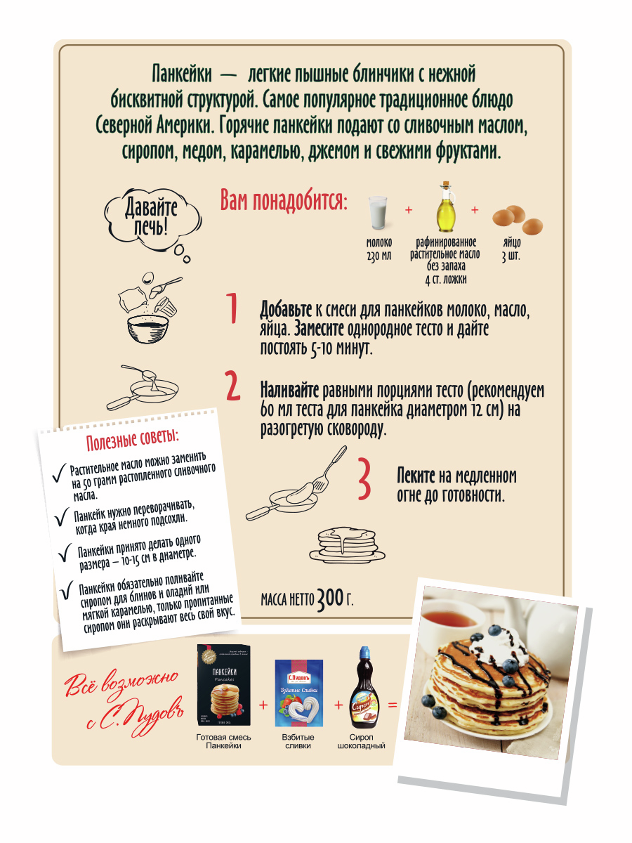 Панкейки – популярное блюдо Северной Америки. За океаном их чаще всего едят на завтрак, но также готовят, когда хотят быстро и сытно перекусить. В отличие от наших блинов, панкейки больше похожи на бисквитные оладьи. Благодаря готовой смеси для выпечки Панкейки торговой марки Золотое утро вы сможете с лёгкостью приготовить этот североамериканский десерт. Одной упаковки готовой смеси достаточно, чтобы приготовить порядка 15 панкейков диаметром 12-13 сантиметров. Готовые панкейки можно украсить ягодами или порезанными фруктами, подавайте их со сливочным маслом и/или сиропом для блинов и оладий Золотое утро.