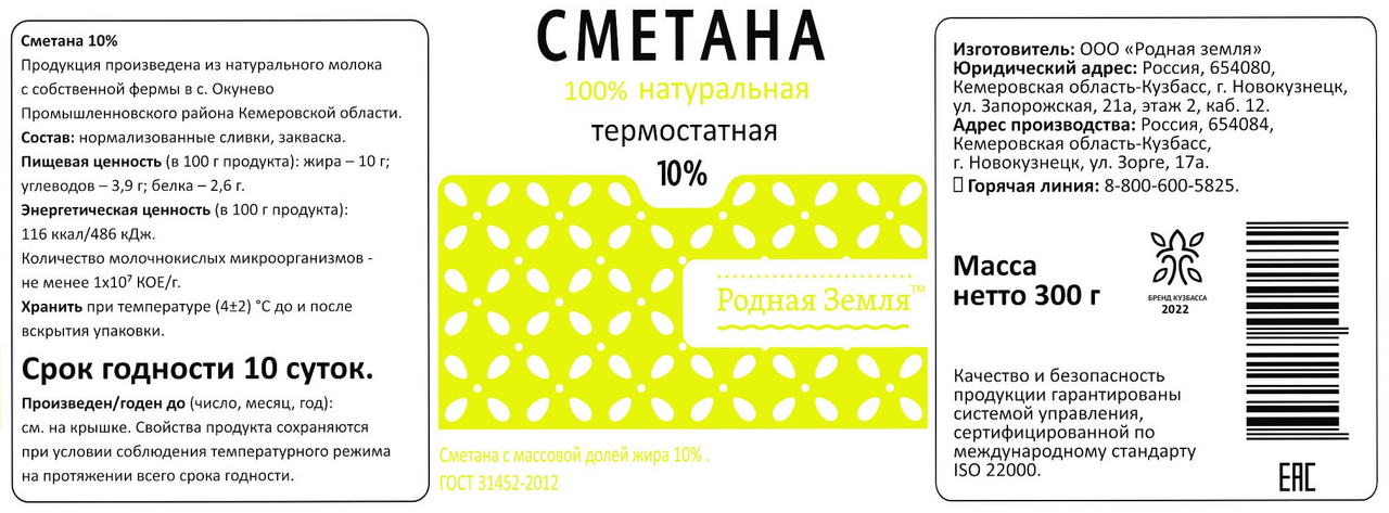 Сметана термостатная Родная земля ГОСТ 10%, 300г