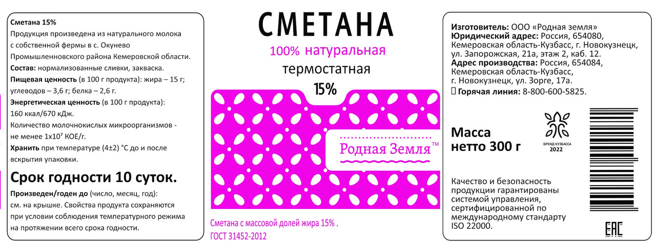 Сметана термостатная Родная земля ГОСТ 15%, 300г