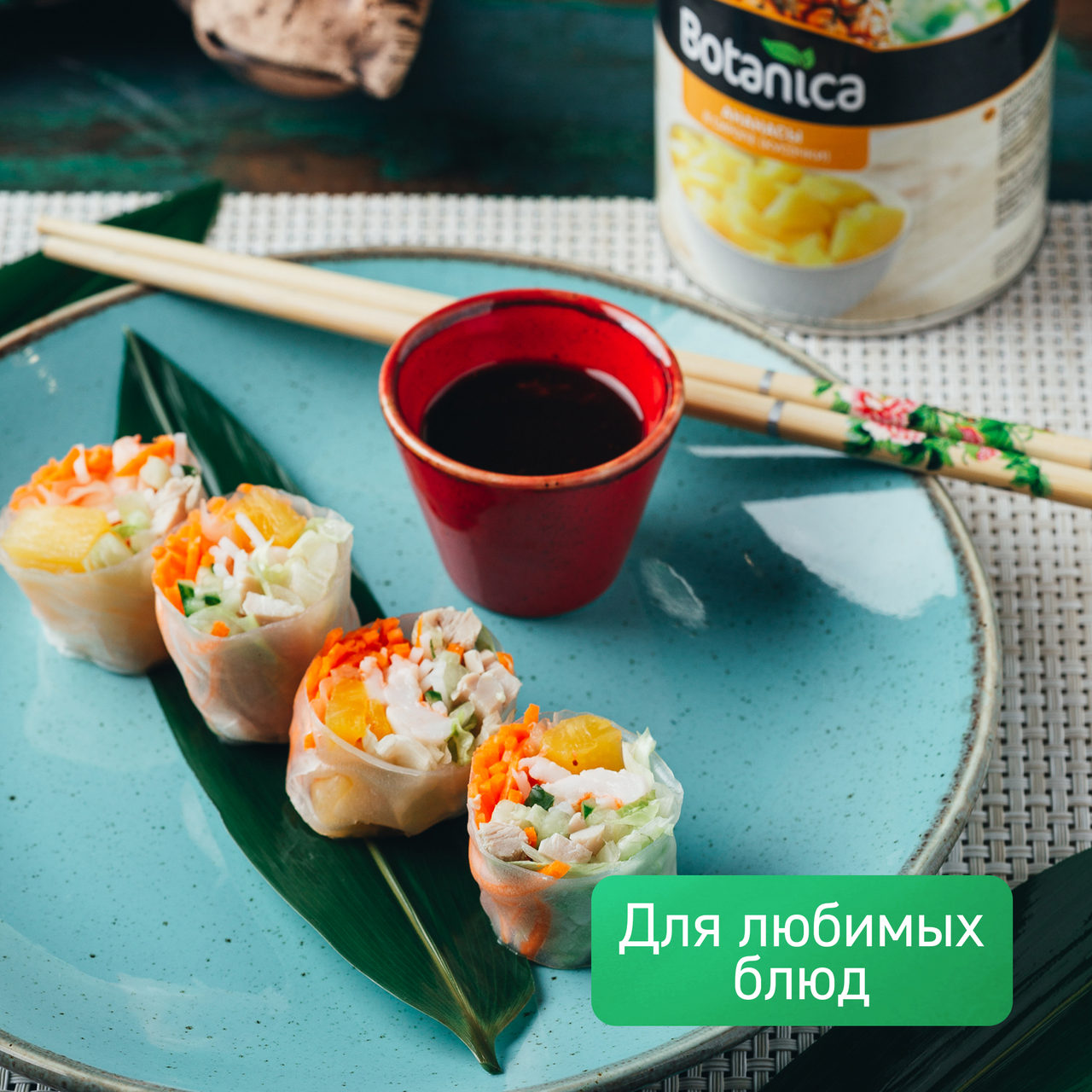 Ананасы консервированные из отборного сорта обладают ярким вкусом и насыщенным ароматом. Продукт уже нарезан на кусочки, что позволяет сэкономить время при готовке. Ананасы идеально подойдут для десертов, салатов, блюд азиатской кухни, а также напитков. Botanica - все, что вкусно выросло. Спелый ананас очищают от кожуры и твердой сердцевины, нарезают небольшими кусочками, а затем консервируют в сладком сиропе. В консервированном виде эти фрукты становятся еще вкуснее и сохраняют большинство полезных свойств. Они обогащают организм витаминами (С и группы В) и минералами (калием, кальцием, марганцем, магнием), а также способствуют нормализации пищеварения. Ананасы можно использовать для приготовления десертов, салатов, компотов, пирогов и пиццы.