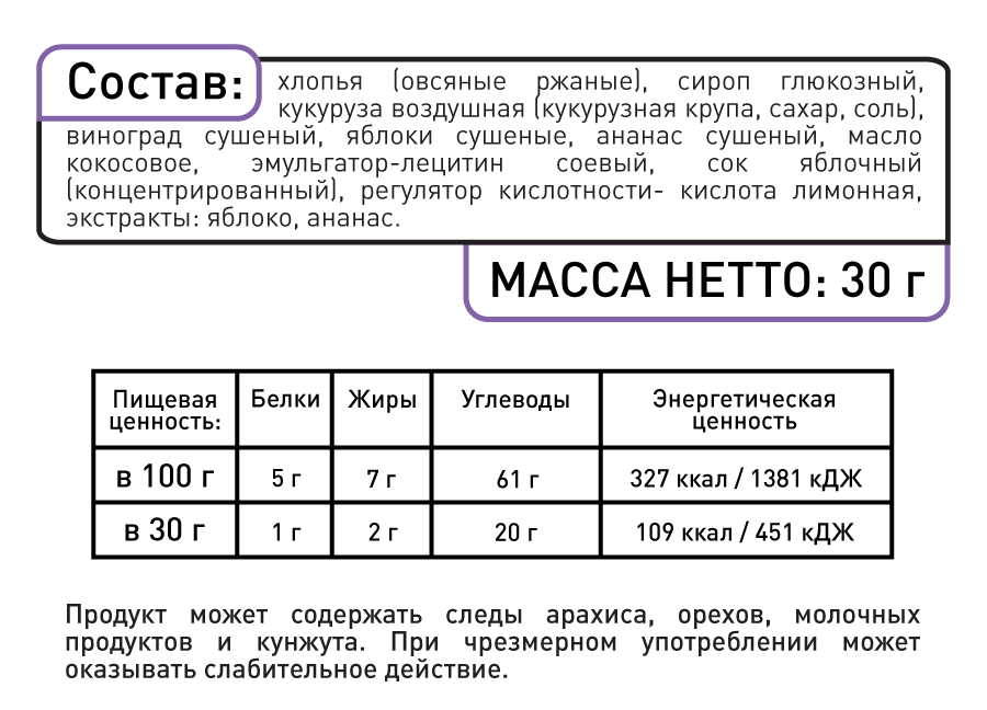 Хлопья овсяные, ржаные, сироп глюкозный, кукуруза воздушная кукурузная крупа, сахар, соль, виноград сушеный, яблоки сушеные, ананас сушеный, масло кокосовое, эмульгатор лецитин подсолнечный, сок яблочный концентрированный, регулятор кислотности - кислота лимонная, экстракты: яблоко, ананас.