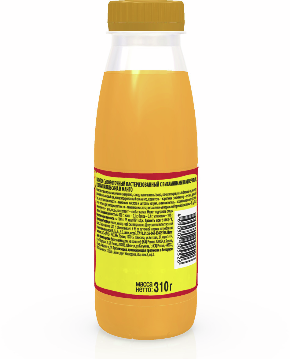 Восстановленная молочная сыворотка; сахар; наполнитель (вода, концентрированный яблочный сок, концентрированный апельсиновый сок, концентрированный сок манго, краситель – каротины, стабилизатор – пектины; ароматизаторы, регуляторы кислотности – лимонная кислота и цитраты натрия, антиокислитель – аскорбиновая кислота); стабилизаторы – пектины, гуаровая камедь; регулятор кислотности – лимонная кислота; витаминно-минеральный премикс (витамины – В1, В6, B3, Е, D; микроэлементы – цинк, медь); консервант – сорбат калия.