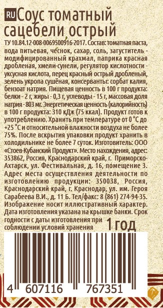 Томатная паста, вода питьевая, чеснок свежий, сахар, соль поваренная пищевая, стабилизатор - крахмал картофельный, паприка красная дроблёная, хмели-сунели, регулятор кислотности - уксусная кислота, перец красный острый дроблёный, укроп, консерванты: сорбат калия, бензоат натрия.