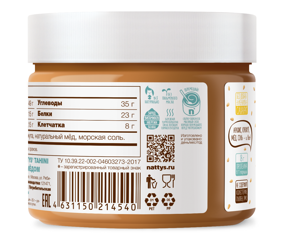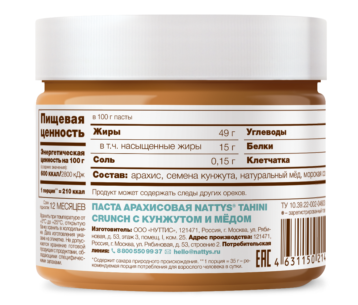 Паста арахисовая Nattys Tahini Crunch с кунжутом и медом, 325 г – полезное, вкусное и питательное лакомство, изготовленное из натурального арахиса и не содержащее в составе сахара. Арахис, входящий в состав этой пасты, измельчен в мелкую крошку и предварительно обжарен. В него также добавлен кунжут и мед, которые делают продукт не только вкусным, но и полезным. Это настоящий кладезь витаминов, минералов и микроэлементов, каждый день необходимых человеку. Паста отличается чистым составом и может стать отличным началом дня, подарив энергию и бодрость или использоваться в качестве небольшого перекуса в школе или на работе. Она хорошо сочетается с ломтиками белого хлеба, сдобы, крекерами, хлебцами.