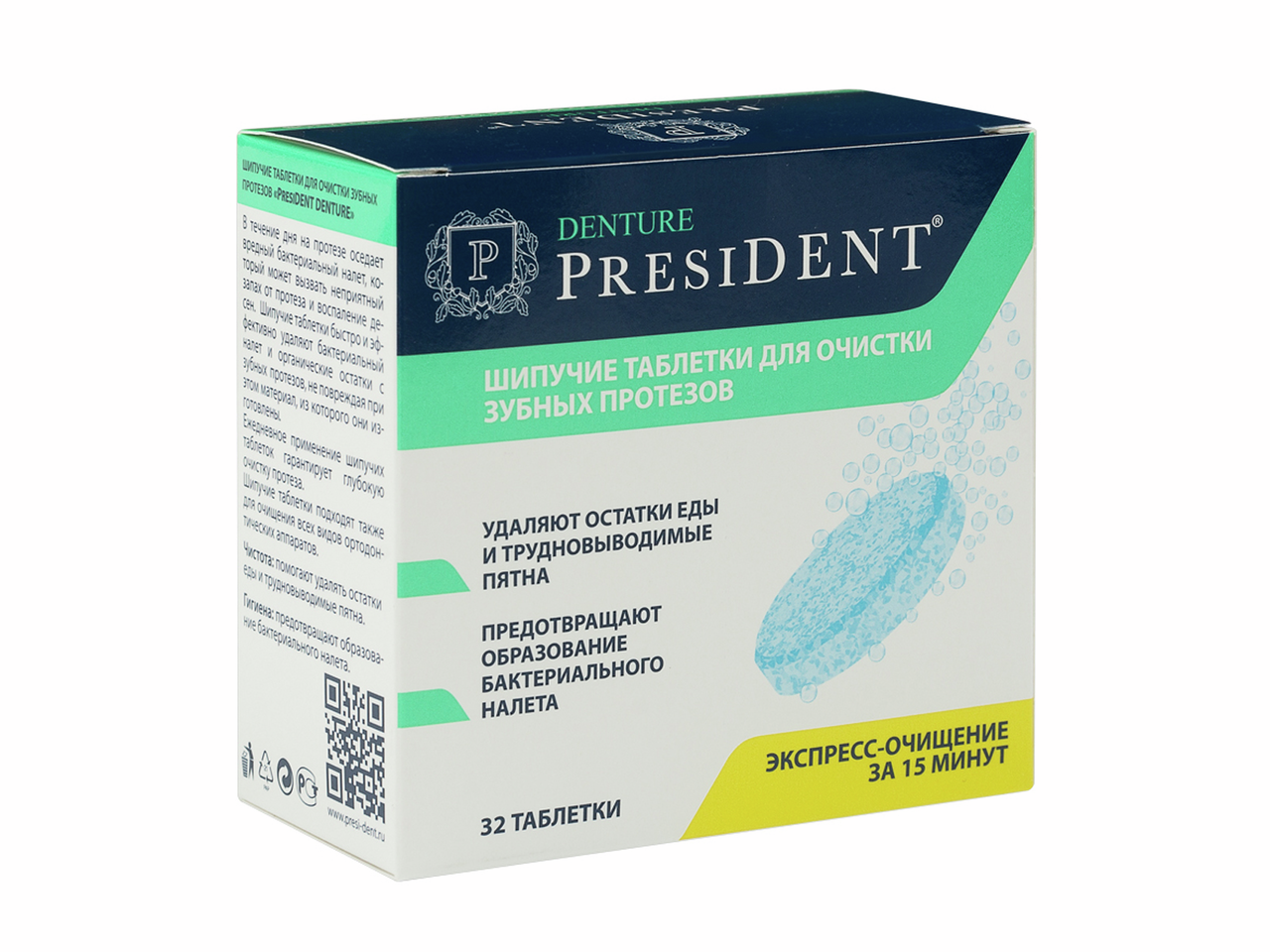 Это специализированные средства по уходу за полостью рта для съемных и частично съемных протезов. Для тех, кто любит активно жить и улыбаться. President Denture шипучие таблетки для очистки протезов - это экспресс-очищение за 15 минут, благодаря специальной формуле. В течении дня на протезе оседает вредный бактериальный налет, который может вызвать неприятный запах от протеза и воспаление десен. Шипучие таблетки быстро и эффективно удаляют бактериальный налет и органические остатки с зубных протезов, не повреждая при этом материал, из которого они изготовлены. Ежедневное применение шипучих таблеток гарантирует глубокую очистку протеза. Шипучие таблетки подходят также для очищения всех видов ортодонтических аппаратов.Способ прим��нения: 1. очистить зубной протез при помощи щетки для чистки протезов. 2. поместить протез в стакан с теплой водой и добавить одну таблетку активного очистителя (протез должен быть полностью покрыт водой). 3. Через 10-15 мин протез становится идеально чистым, гигиеничным и свежим. 4. Перед установкой протеза его необходимо промыть проточной водой и высушить.
