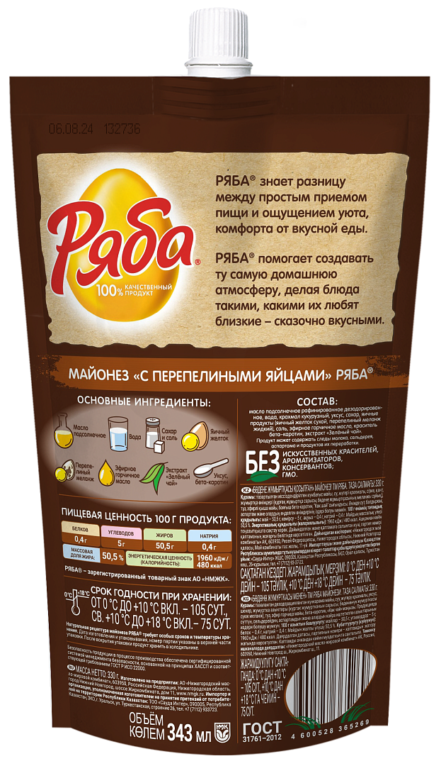 В состав майонеза Ряба С перепелиными яйцами входят перепелиные яйца, по своим питательным свойствам значительно превосходящие куриные. Нежная консистенция и мягкий вкус этого соуса заставят привычные блюда зазвучать по-новому. Незаменимый компонент для приготовления многих популярных салатов и горячих блюд. Вкусный майонез можно добавлять и в различные гарниры, если хочется их разнообразить. Основа состава соуса - свежие перепелиные яйца, отличающиеся повышенной питательностью и придающие изысканный вкус майонезу.
