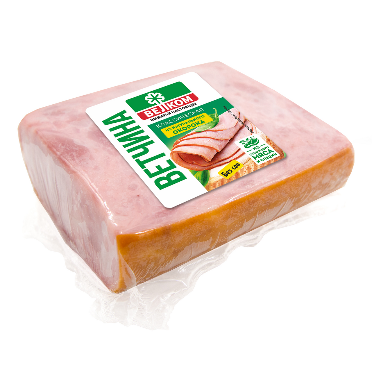 Копчение на буковой щепе и натуральный окорок в составе ветчины придают ей неповторимый аромат. Станет отличным перекусом в качестве бутербродов и сэндвичей.