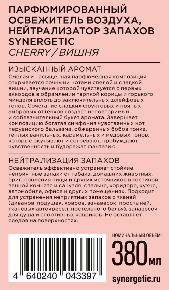 Освежитель воздуха парфюмированный Synergetic Вишня, 380мл