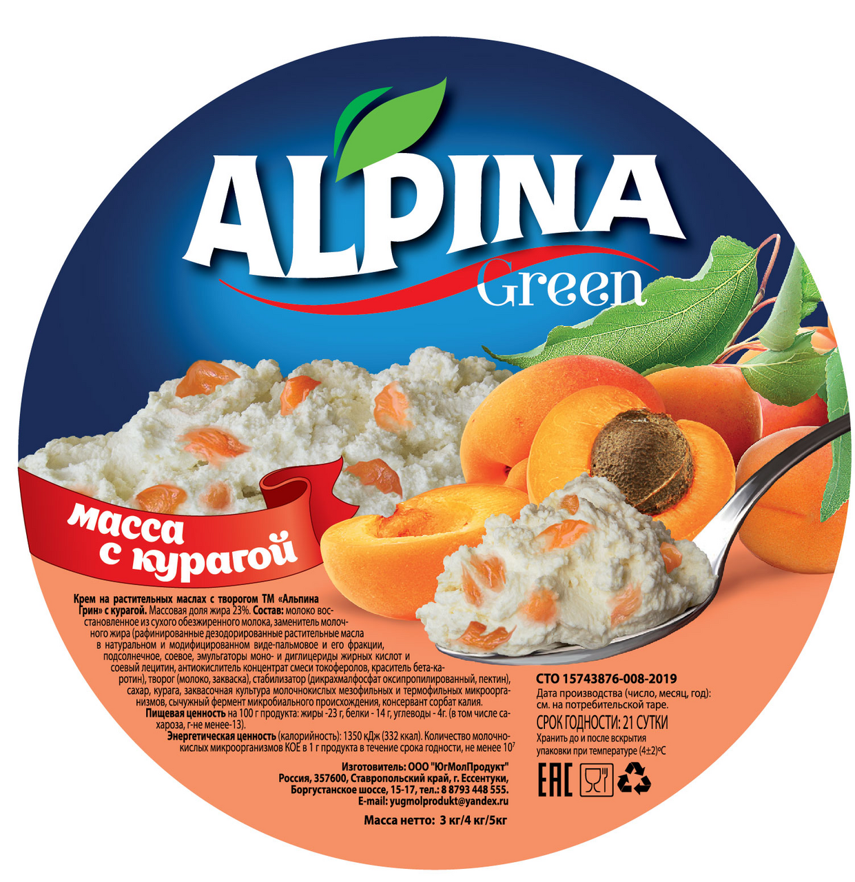 Продукт молоко-растительный Alpinagreen на творожной закваске с курагой, 3кг