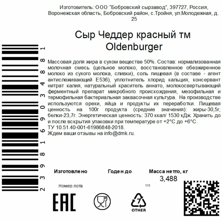 Сыр Oldenburger чеддер красный 50%, ~3кг