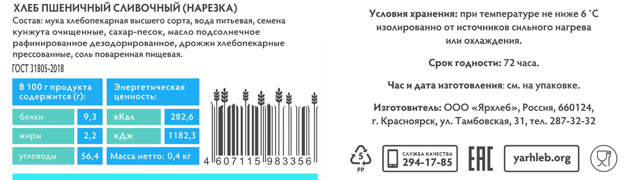 Хлеб Ярхлеб пшеничный сливочный с кунжутом, 400г