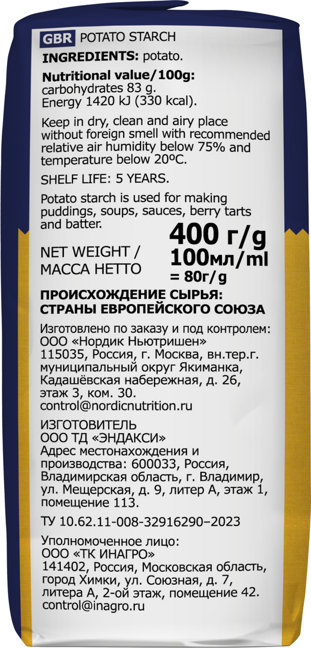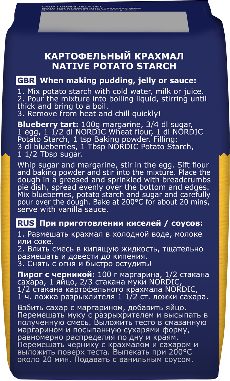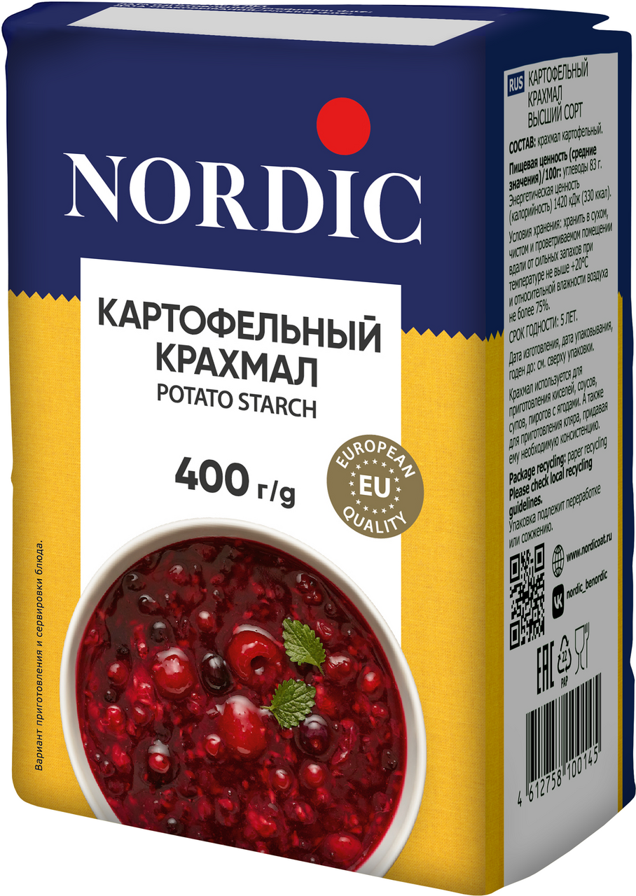 Картофельный крахмал Nordic произведен из финского сырья.При его производстве используется специальный сорт высоко крахмалистого картофеля.Крахмал Nordic обладает стабильным качеством (как ингредиент) и дает всегда ожидаемый результат готового продукта, а также отличается равномерным расходом продукта (хватает на долгое время).Крахмал Nordic высокого оценен как обычными потребителями, так и профессионалами-шеф-поварами.Согласно отзывам потребителей крахмал идеально подходит для использования в домашних условиях для приготовления соусов, варенья, пирогов с ягодами, киселей (кисель остается прозрачным, не мутнеет).Идеален для кляра (придает ему стеклянный вид благодаря чистоте и высокому качеству продукта).
