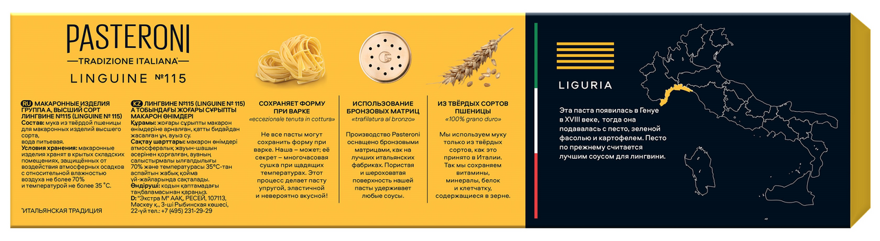 Спагетти широкой плоской формы родом из региона Лигурия, где еще в XVIII веке она подавалась с соусом песто, зеленой фасолью и картофелем. Качество макарон и сохранение их вкуса обеспечивает медленная сушка при низких температурах.