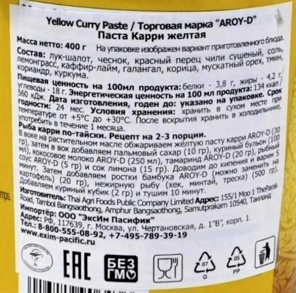 Паста aroy-D Карри желтая, 400г представляет собой идеальный вариант приправы к блюдам из птицы, рыбы, овощей и картофеля. Она отличается насыщенным, пикантным вкусом и приятным ароматом. В основе продукта лежат лук-шалот, чеснок, красный перец чили, лемонграсс и многое другое. Не содержит вредных добавок. Паста имеет желтый цвет из-за куркумы, которая в нее добавлена, благодаря чему окрашивает все блюда. Она оказывает положительное воздействие на организм. Паста оказывает антисептическое действие и способствует улучшению пищеварения. С ней готовят разные супы, бульоны и морепродукты. Она выпускается в компактной пластиковой банке, которая обеспечивает удобное хранение и транспортировку. Рекомендуется хранить в сухом, прохладном месте.