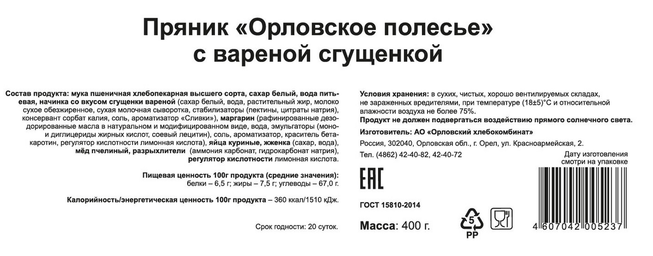 Пряник Орловский хлебокомбинат Орловское полесье с вареной сгущенкой, 400г
