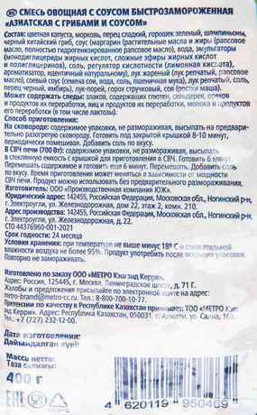 Цветная капуста, морковь, перец сладкий, горошек зеленый, шампиньоны, черный китайский гриб, соус (маргарин (растительные масла и жиры (рапсовое масло, полностью гидрогенизированное рапсовое масло), вода, эмульгаторы (монодиглицериды жирных кислот, сложные эфиры жирных кислот и полиглицеринов), соль, регулятор кислотности (лимонная кислота), ароматизатор, идентичный натуральному), лук жареный (лук репчатый, рапсовое масло) соевый соус (семена сои, вода, соль, пшеничная мука), лук репчатый, соль, перец черный, имбирь), лук-порей, горох стручковый, соя (ростки маша).