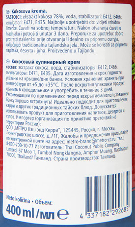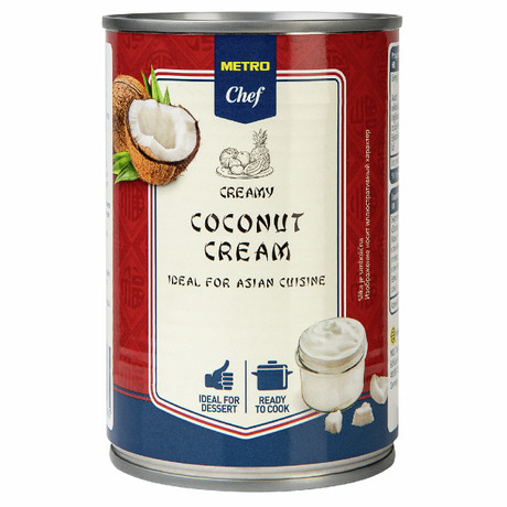 Metro Chef Крем кокосовый кулинарный 21-22%, 400мл изысканный продукт из натуральных компонентов, в котором содержится кокосовый экстракт. Данные сливки можно использовать для приготовления азиатских супов, освежающих напитков, как подливу при жарке мяса, курицы, морепродуктов, а также добавлять в кашу для придания ей невероятного аромата кокоса. Мякоть кокосового ореха содержит большое количество аминокислот, витаминов С, Е и группы В, антиоксидантов, калия, цинка, марганца, фосфора, кальция и других полезных минералов.