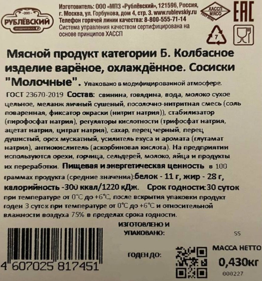 Основные составляющие молочных сосисок - свинина, говядина и молоко, гармонично дополнены тщательно подобранными специями. Эта комбинация не надоедает даже при частом употреблении. Отметим, что сосиски этого сорта не только аппетитно выглядят. С их помощью можно быстро восстановить энергетические запасы организма, в том числе и после интенсивных физических нагрузок.