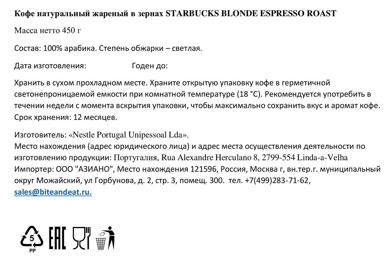 Кофе Starbucks Blonde Espresso Roast зерновой, 450г