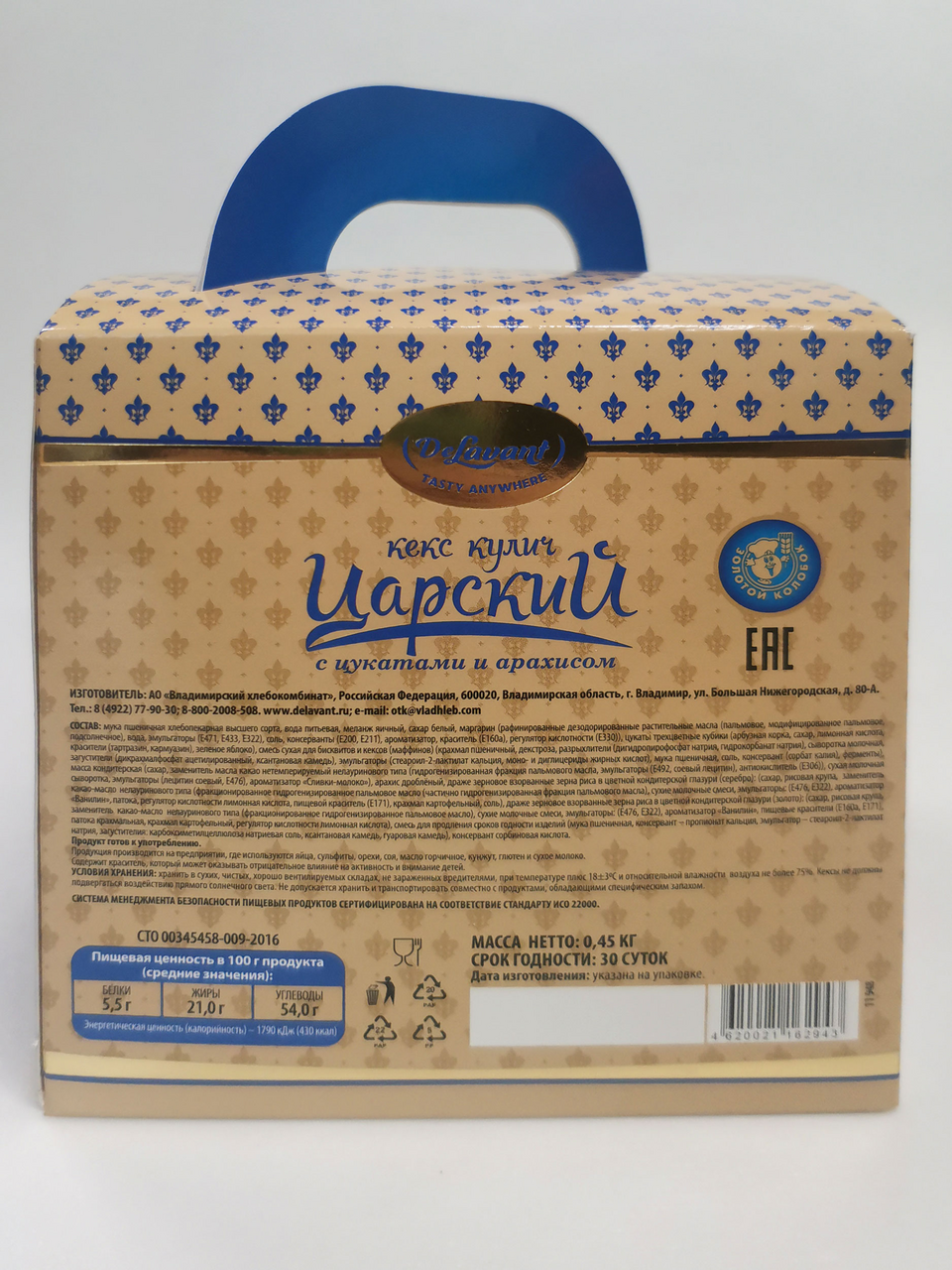 Оригинальный дизайн упаковки и насыщенный вкус кулича Царского с цукатами и арахисом прекрасно дополнит и украсит пасхальный стол. Царский кулич имеет влажную пористую структуру и приятный аромат. Наполненность цукатами делает кулич очень красивым на срезе. Имеет изысканный вкус, воздушную структуру, приятный ореховый аромат. Сочетает сладкие разноцветные цукаты и жареный дробленый арахис. Удобная упаковка с оригинальным дизайном создаст праздничное настроение и украсит пасхальный стол.