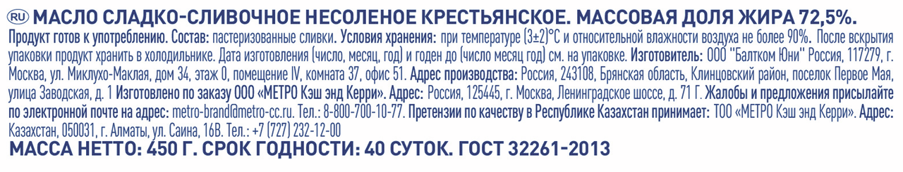 Metro Chef Масло сливочное Крестьянское 72.5%, 450г обладает нежным вкусом и тонким ароматом. Для его создания использовались пастеризованные сливки из коровьего молока. Благодаря этому продукт богат белком, витаминами А, К, D, Е, минералами и другими микрокомпонентами. Масло рекомендуется включать в ежедневный рацион растущих детей, пожилых людей, спортсменов и тех, кто занят умственным и физическим трудом. Умеренное упо��ребление (10-20 грамм в сутки) укрепляет иммунитет, улучшает работу головного мозга, нормализует функционирование нервной и сердечно-сосудистой систем. Полезные компоненты сливочного масла снижают негативное влияние тех продуктов, которые повышают уровень холестерина в крови. Масло активно применяется в кулинарии и входит в рецептуру очень многих блюд. С ним готовят блины, пироги, торты и различную сдобную и несладкую выпечку. Традиционно с маслом делают сытные и питательные бутерброды, сэндвичи и фуршетные канапе. Оно добавляет румяную золотистую корочку жареному картофелю, грибам, тостам, овощам и куриному филе.