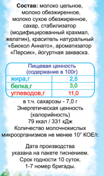 Молоко обезжиренное, молоко сухое обезжиренное, сахар, стабилизатор Е442, желатин, пектин, красител натуральный, ароматизатор персик, йогуртовая закваска.