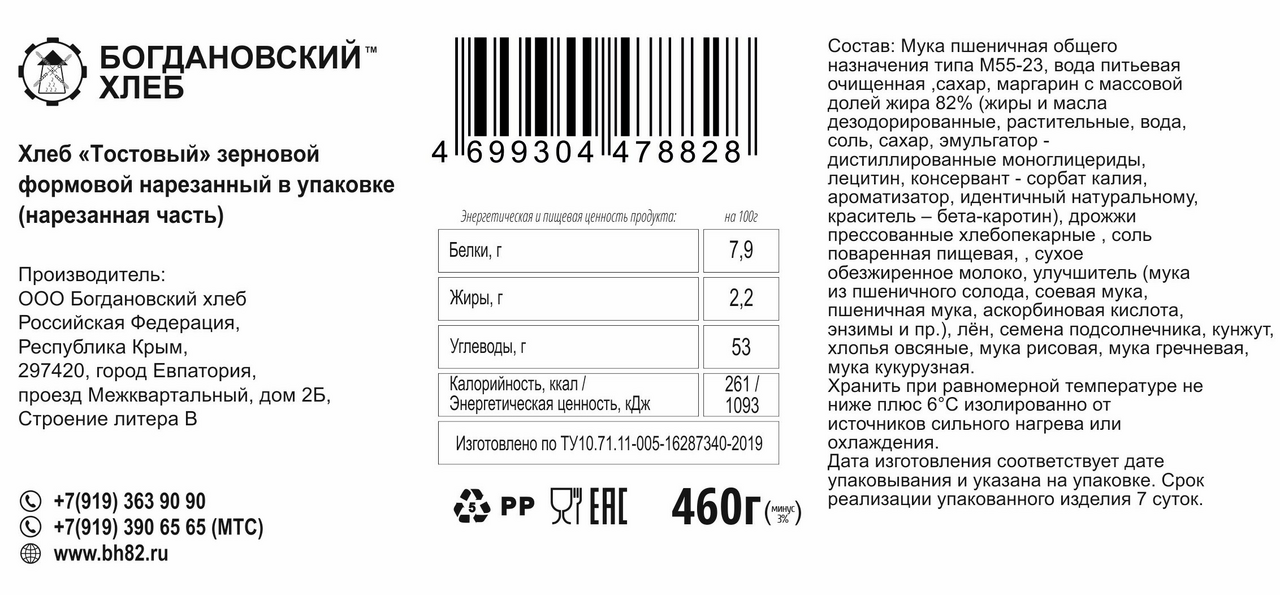 Хлеб Богдановский хлеб тостовый зерновой нарезной, 460г