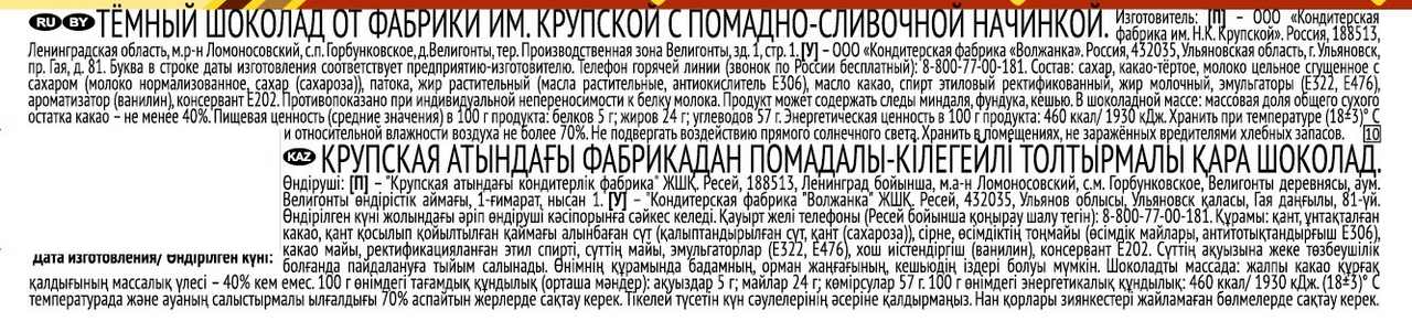Темный шоколад с помадно-сливочной начинкой. Это вкусное лакомство, которое готовят по оригинальной рецептуре. В ней используется базовый состав знаменитой шоколадки, который дополнен начинкой. Для изготовления плитки используются высококачественные продукты. Основным ингредиентом является какао. Оно поднимает настроение, заряжает энергией, обеспечивает зарядом бодрости и стимулирует работу головного мозга. В нем содержится триптофан. Это вещество стимулирует выработку гормона удовольствия, серотонина, который устраняет признаки депрессии и улучшает общее состояние. Шоколад станет отличным дополнением к чаю, кофе, сокам и другим напиткам (газированным, кисломолочным, холодным и горячим). Его можно подать в качестве десерта после основных блюд или как самостоятельное лакомство. Несколько кусочков шоколада заменят завтрак или ланч. Они отлично утолят голод. Плитка может стать отличным презентом для знакомых или коллег по работе. Конфетам одинаково обрадуются взрослые и маленькие сладкоежки. К тому же это отличная альтернатива калорийным пирожным и тортам и хорошая идея для похода в гости.