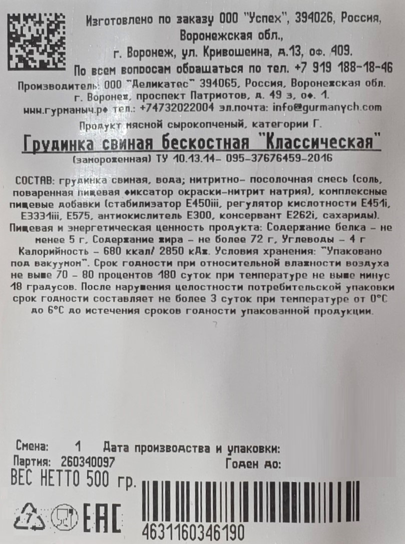 Грудинка свиная Мясорезка сырокопченая, 500г