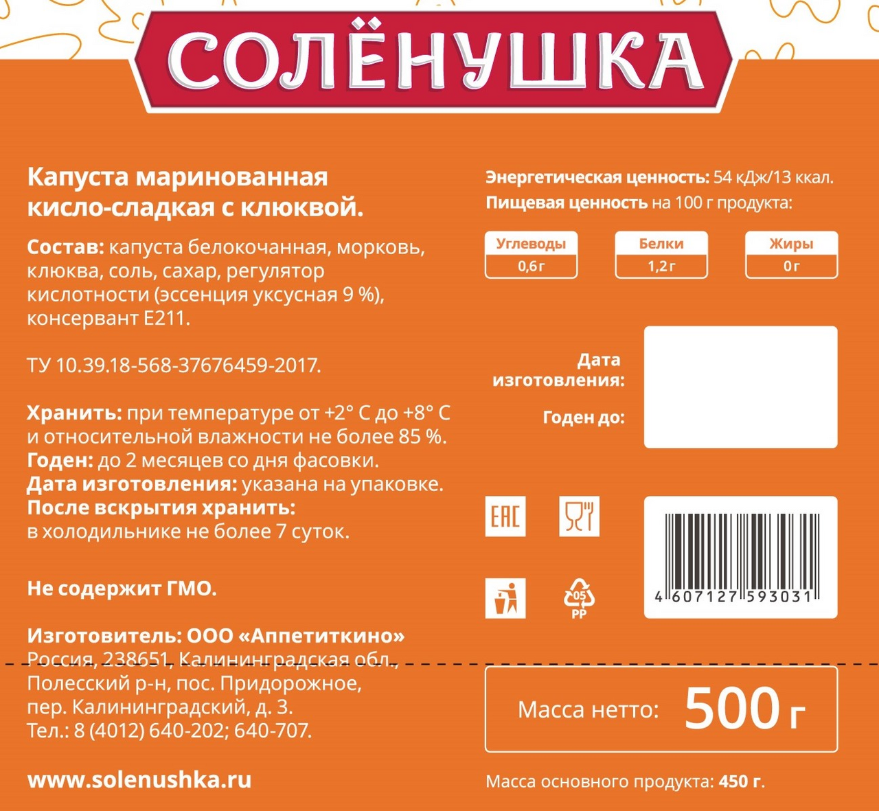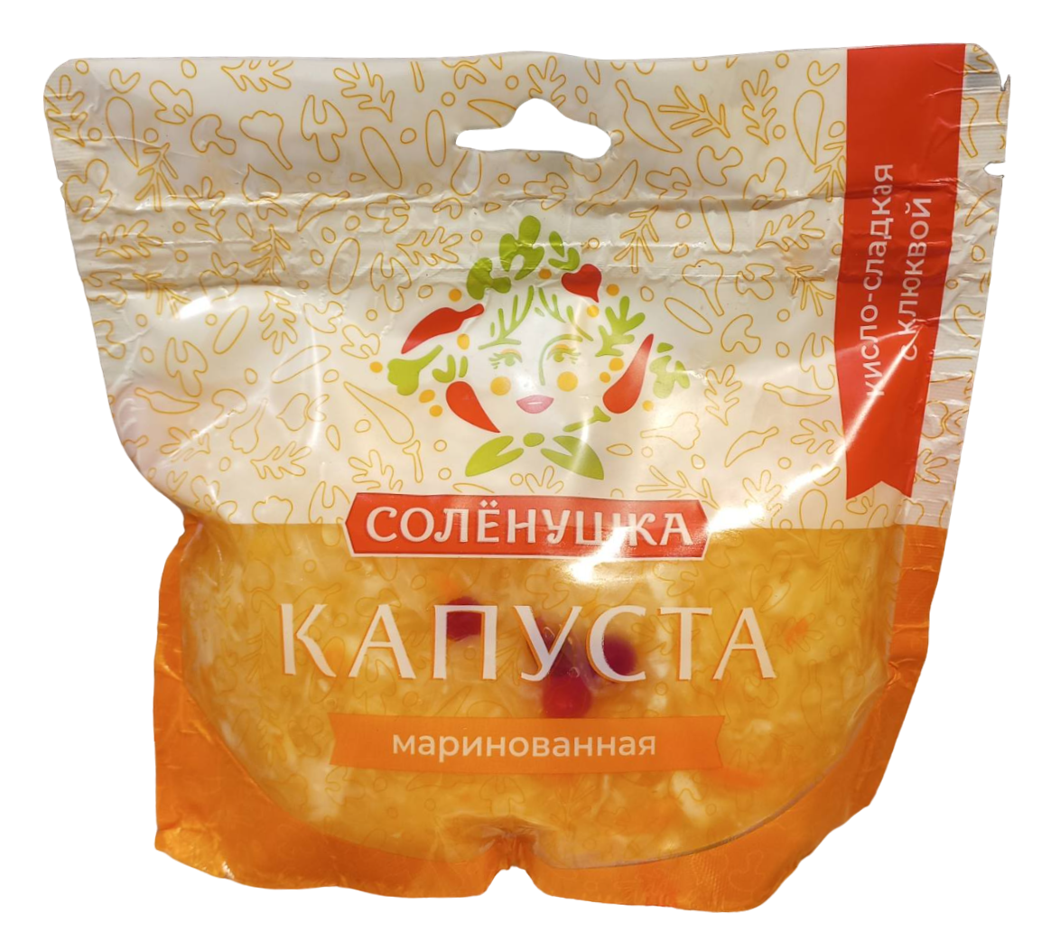 Натуральная закуска, изготовленная из отборных, тонко нашинкованных овощей (капусты и моркови) с добавлением клюквы и соли. Производится методом естественного квашения, что позволяет сохранить все полезные свойства ингредиентов. Аппетитная, хрустящая и слегка кисловатая квашеная капуста – традиционное русское угощение, которое украсит стол и в будни, и в праздники. Ее можно подавать в качестве дополнения к основным блюдам, а также использовать для приготовления щей, винегрета, рагу, пирогов, вареников, кулебяк.