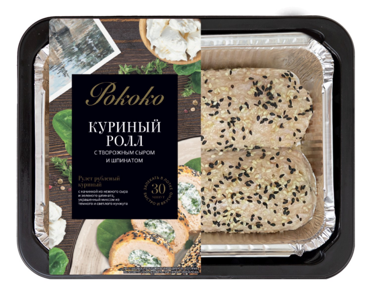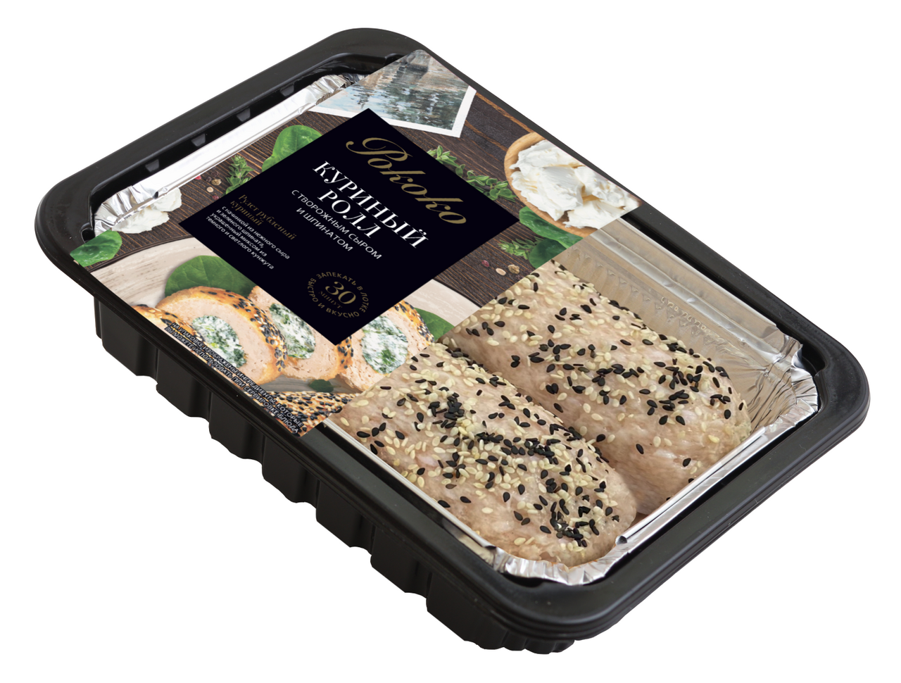 Станет изысканным блюдом на праздничном или повседневном столе. Начинка из нежного творожного сыра придает блюду легкий сливочный вкус и приятный аромат. Ролл запекается в духовке в течение 30-40 минут по инструкции на упаковке.